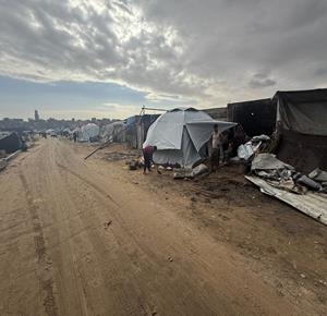 عائلات نازحة تتجمع حول النار للتدفئة في مدينة غزة في ظل الأجواء الباردة