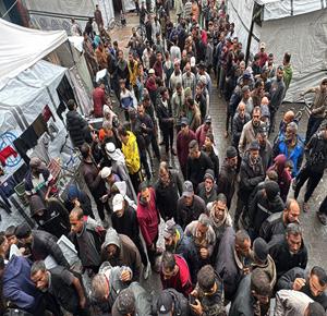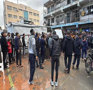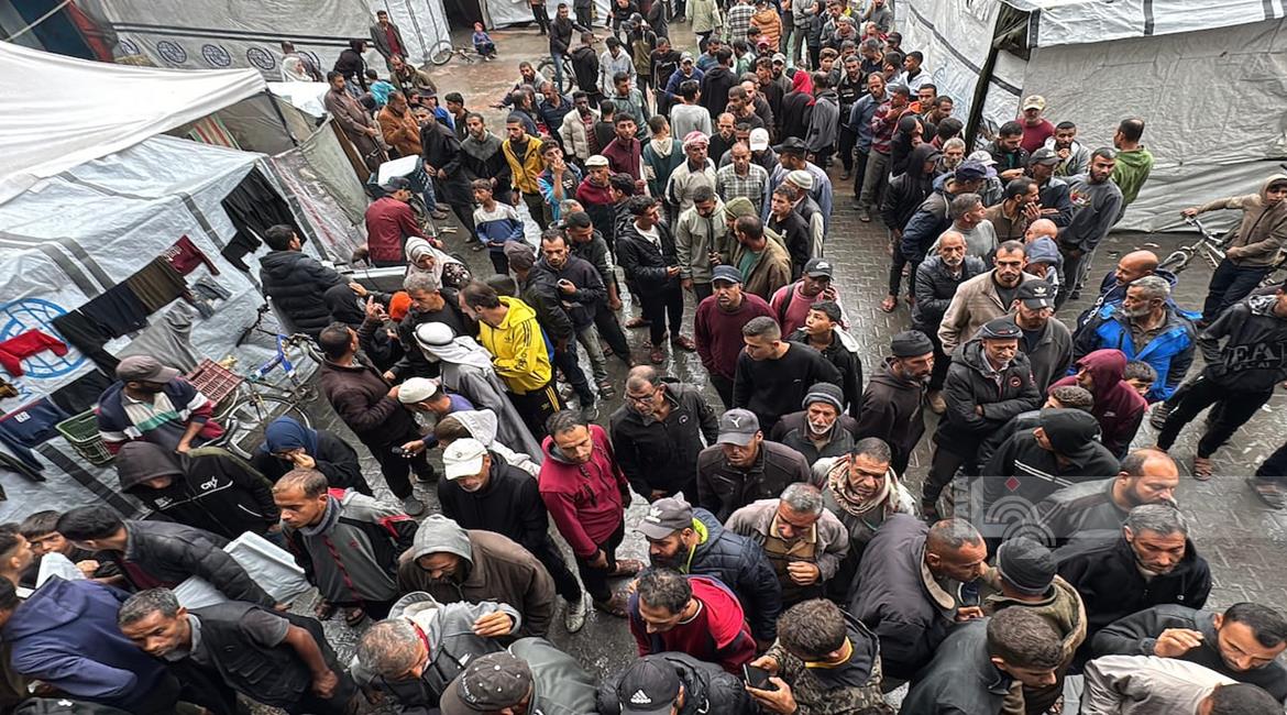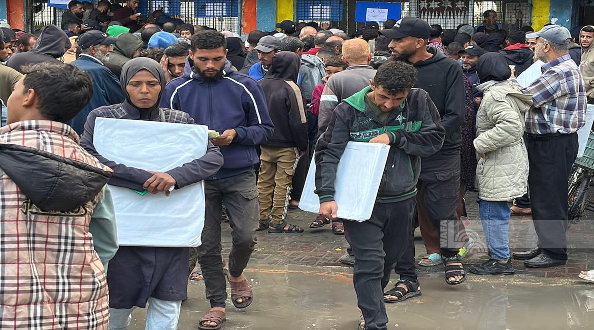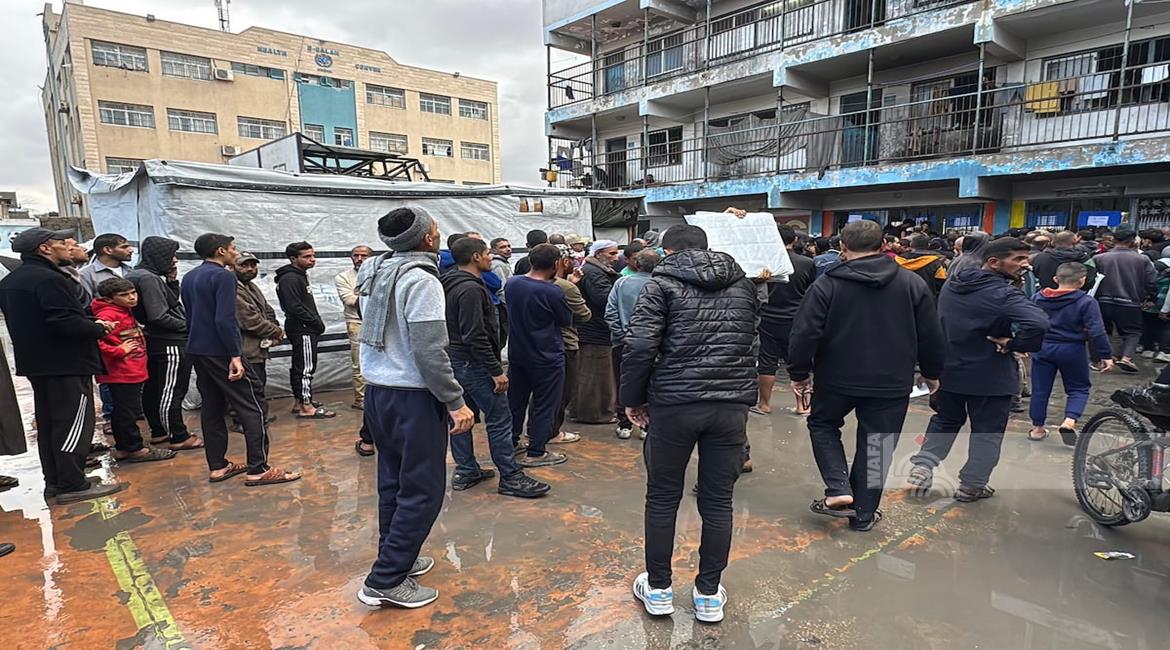 غزة - مواطنون يتجمعون في طابور للحصول على الشوادر من مركز توزيع تابع للأونروا في دير البلح في وسط قطاع غزة