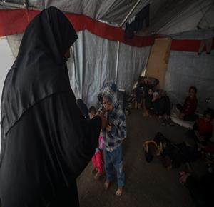 المواطنة آلاء شبات، تعيش مع أطفالها الستة في خيمة نصبت داخل مقبرة النمساوي بخان يونس جنوب قطاع غزة