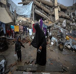 فنانون فلسطينيون يرسمون جدارية وسط ركام المنازل في خان يونس تمهيداً لعرضها في قمة المناخ بالبرازيل