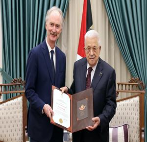 رام الله - الرئيس محمود عباس، يمنح الدبلوماسي النرويجي جاير بدرسون، نجمة الصداقة من وسام الرئيس محمود عباس