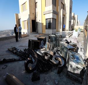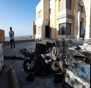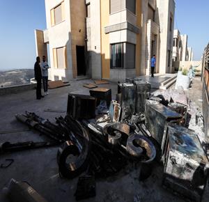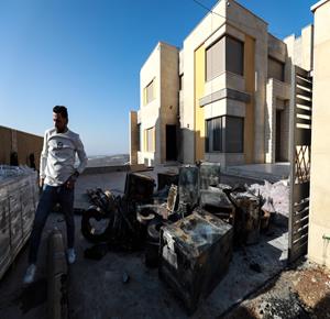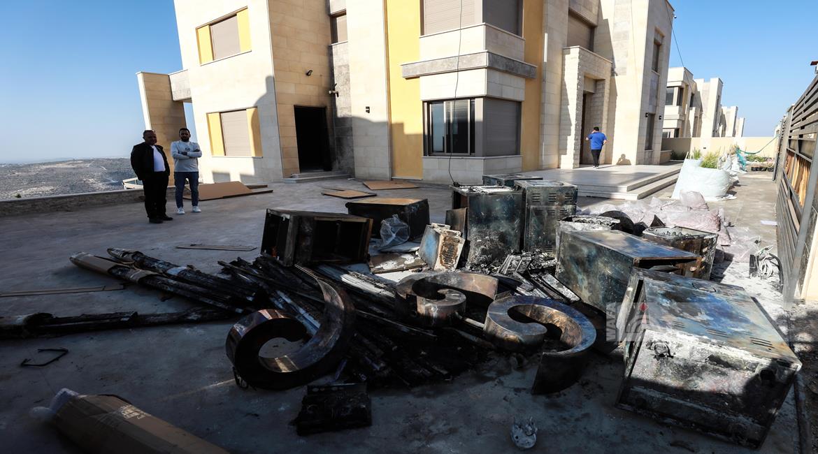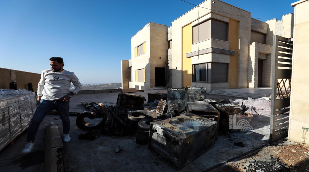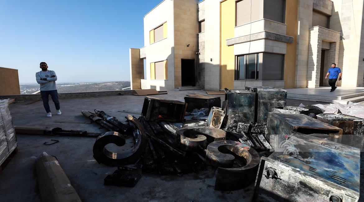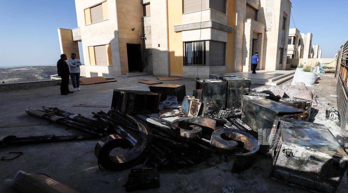 نابلس - مواطنون يتفقدون عدد من الفلل التي أحرقها المستعمرون بالقرب من قرية اللبن الشرقية بمدينة نابلس فجر اليوم