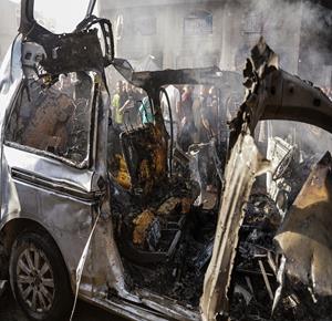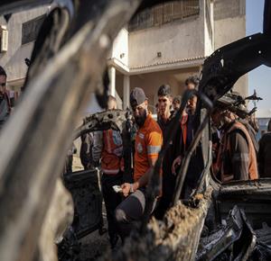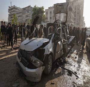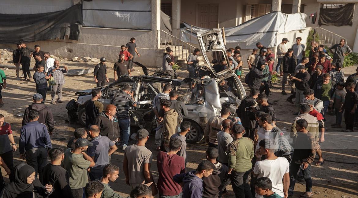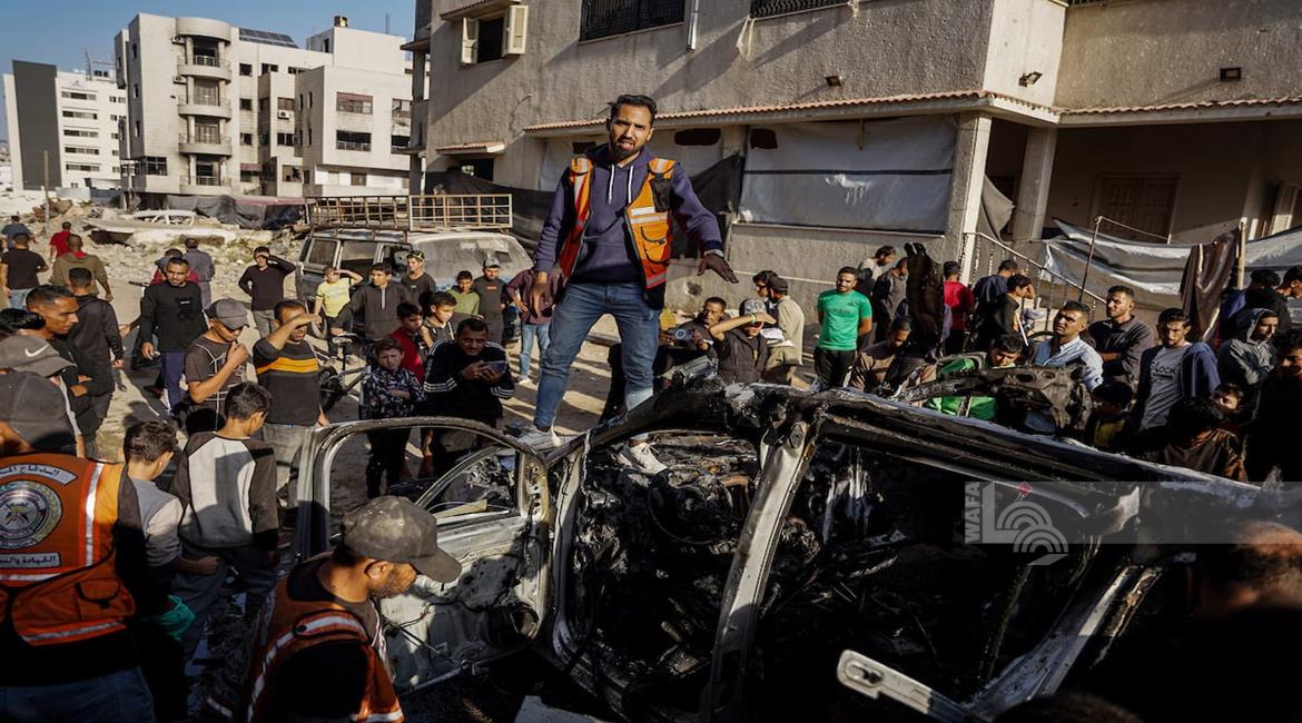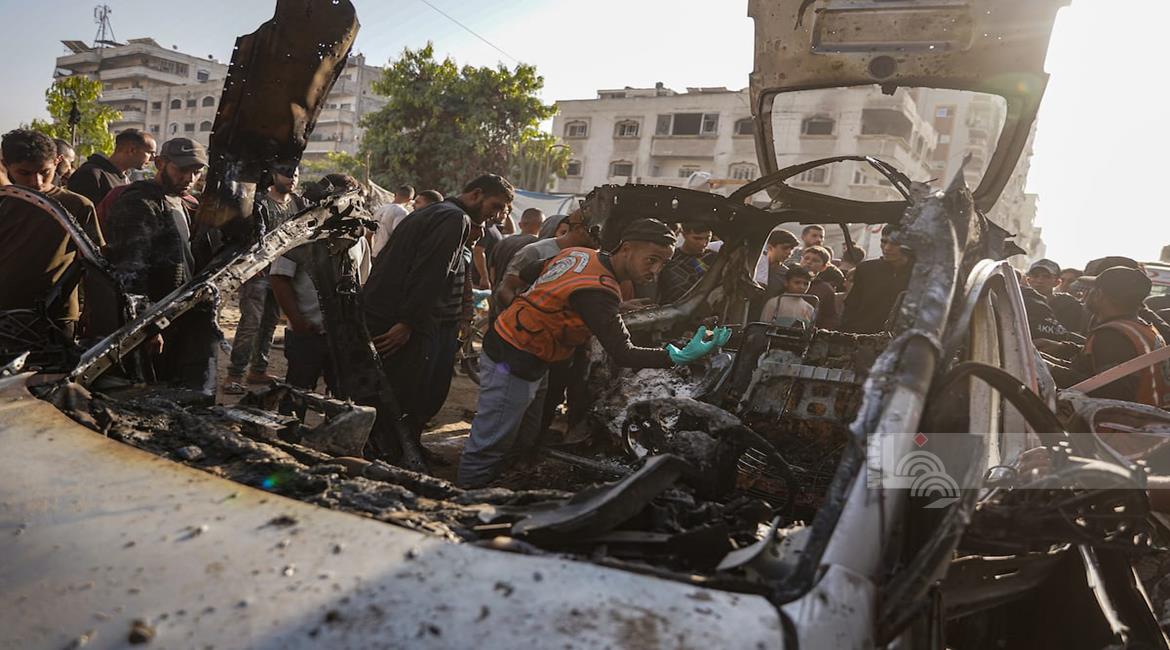 غزة - مواطنون يتفقدون المركبة التي استهدفت بقصف إسرائيلي في منطقة العباس غرب مدينة غزة