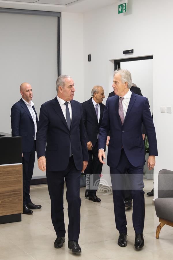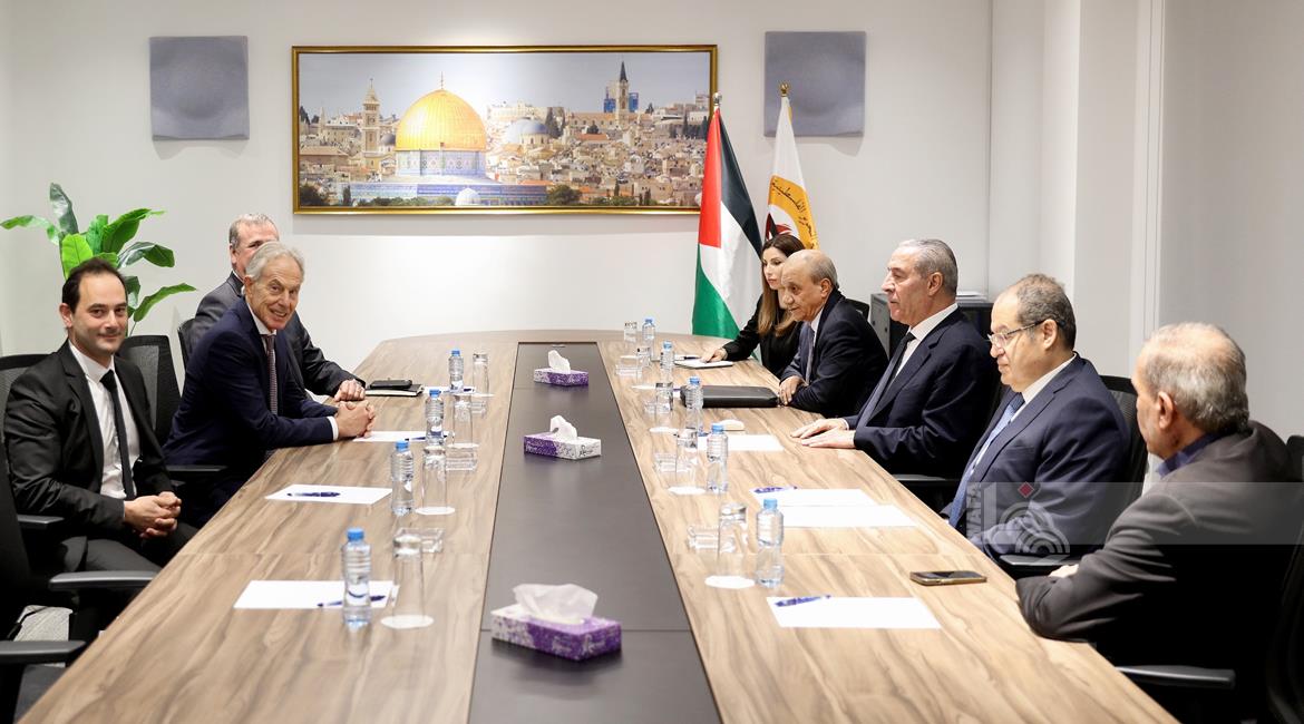 رام الله - نائب رئيس دولة فلسطين، نائب رئيس اللجنة التنفيذية لمنظمة التحرير، حسين الشيخ يناقش مع توني بلير وممثل عن الحكومة الامريكية اخر التطورات بعد قرار مجلس الامن الدولي