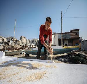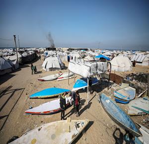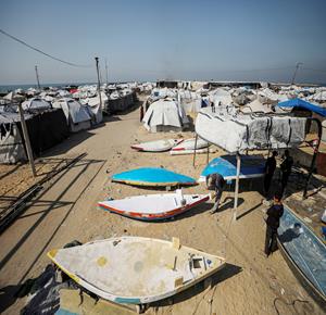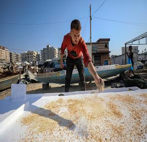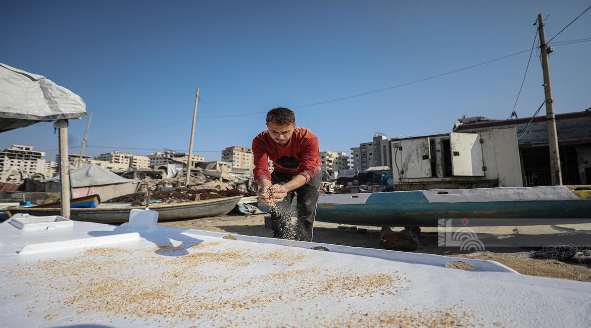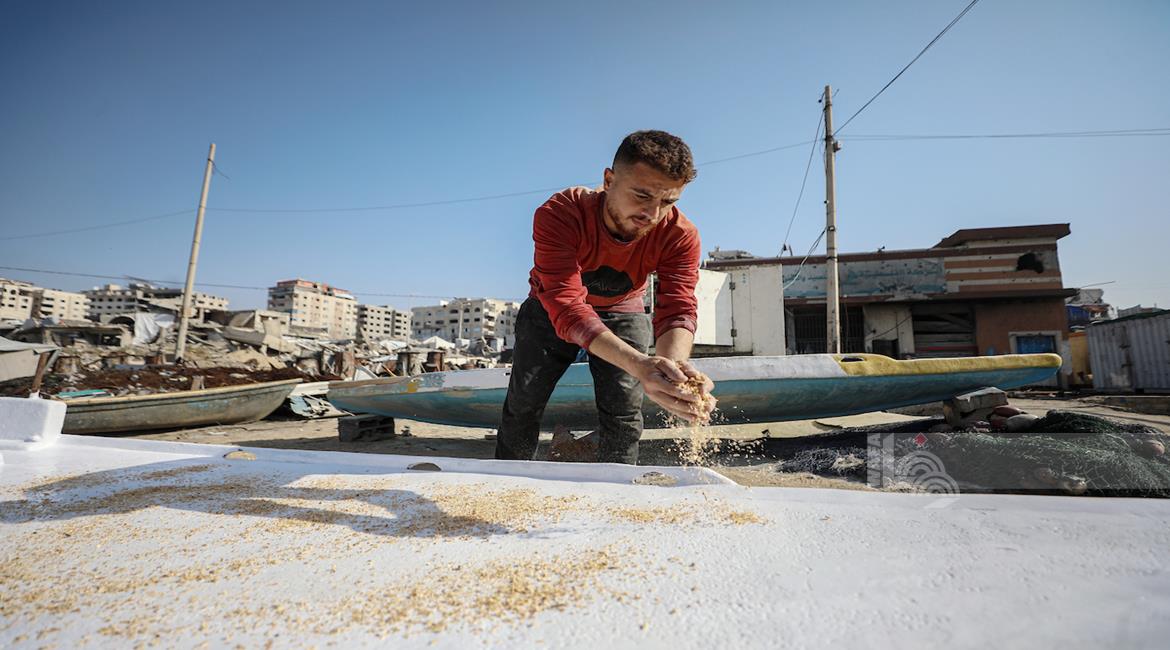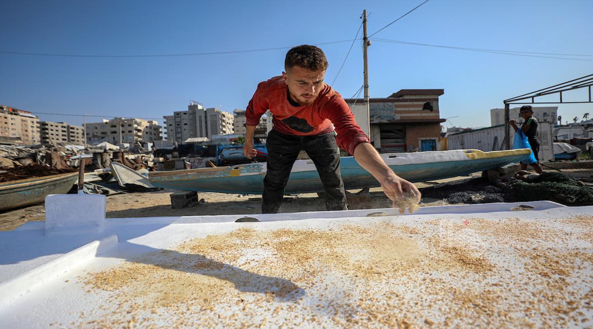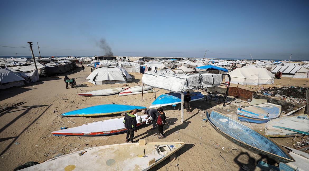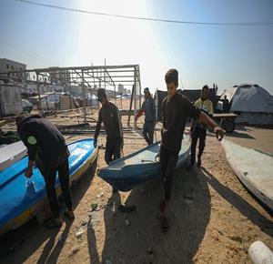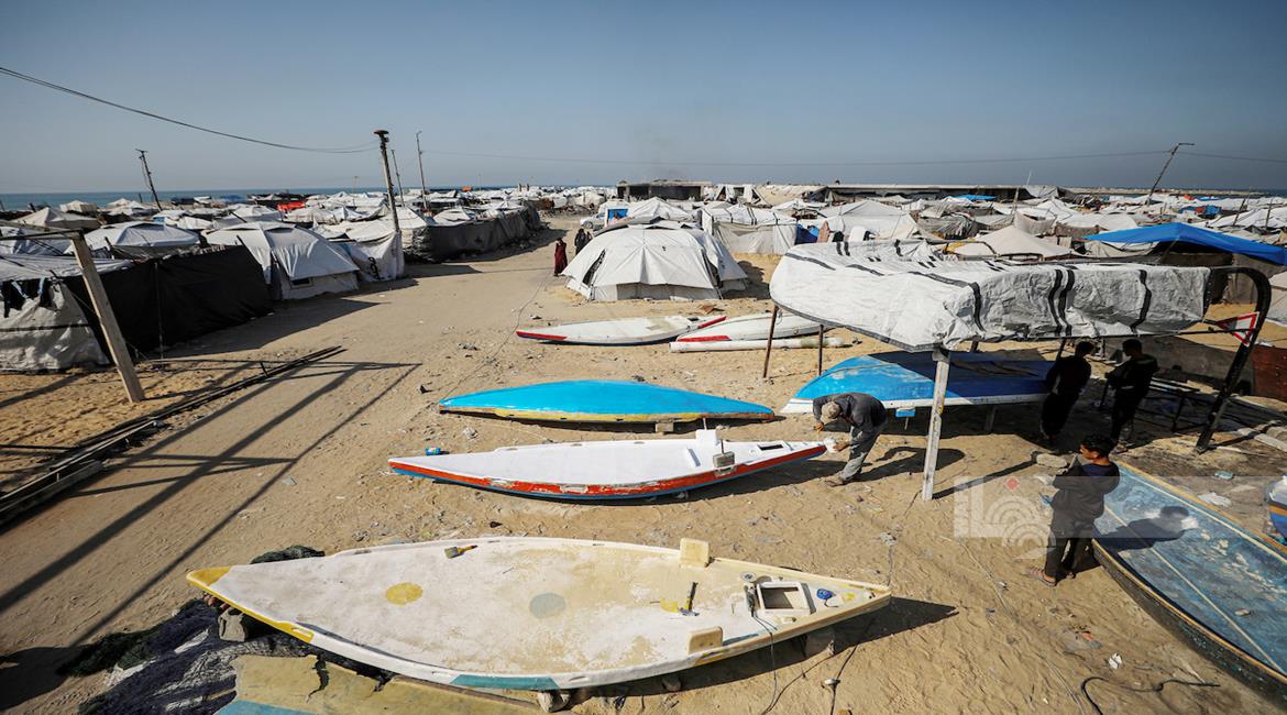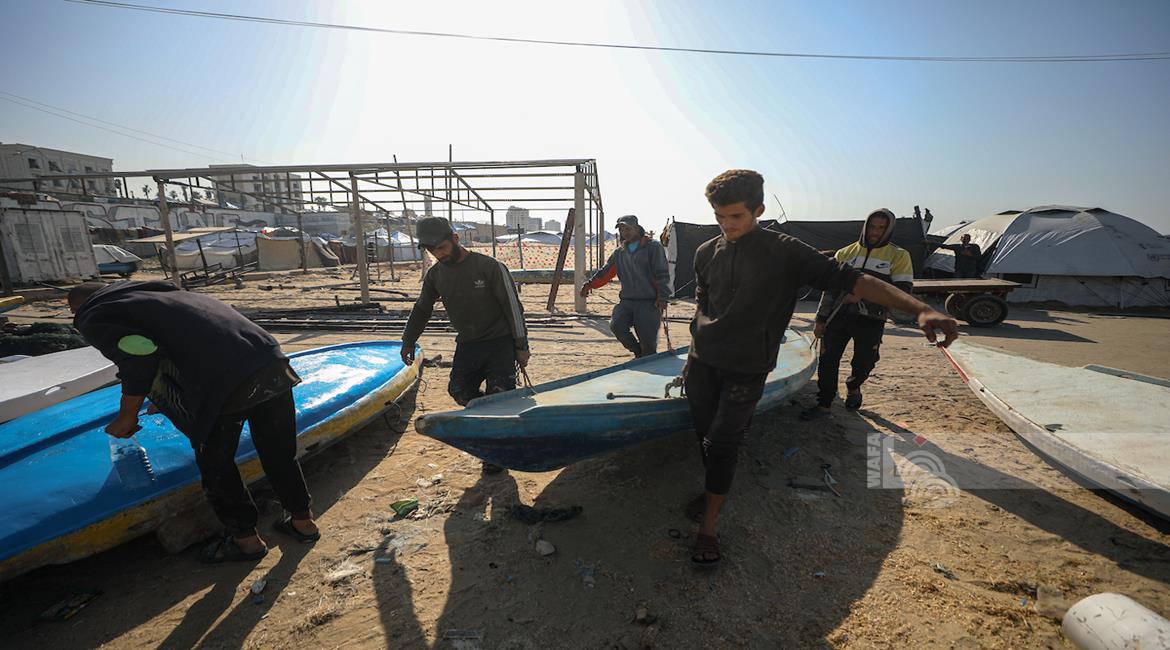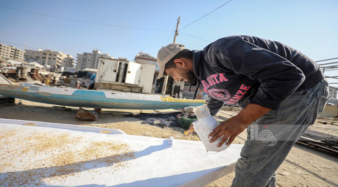 غزة - حرفيون يُصلحون قوارب الصيد في ورشة بميناء غزة، حيث تضررت العديد من القوارب أو أصبحت غير صالحة للاستخدام خلال الحرب
