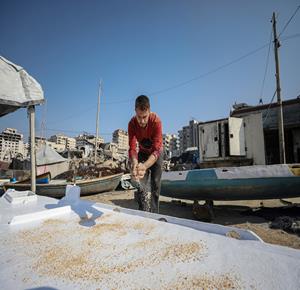 صيادون نازحون يجمعون صيدهم من الشباك التي أُحضرت إلى الشاطئ في دير البلح، في وسط قطاع غزة