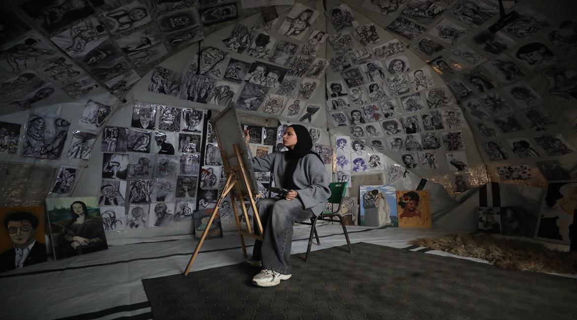 الرسامة مرَح الزعانين (18 عاما) تحول خيمة نزوحها في مدينة غزة إلى مساحة فنية صغيرة مستندة إلى موهبتها في الرسم منذ الطفولة