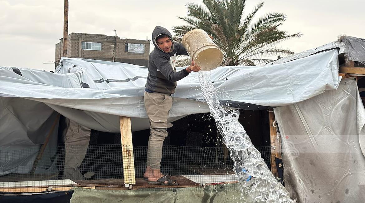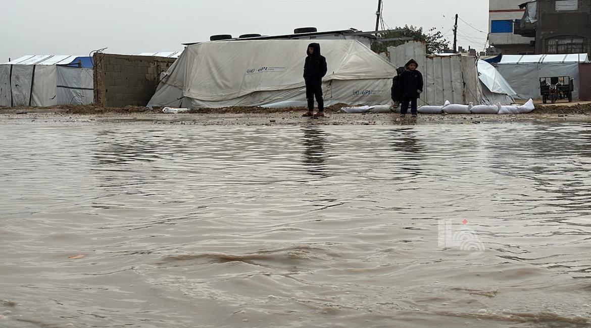 مياه الامطار تغرق خيام النازحين في حي الزيتون بمدينة غزة