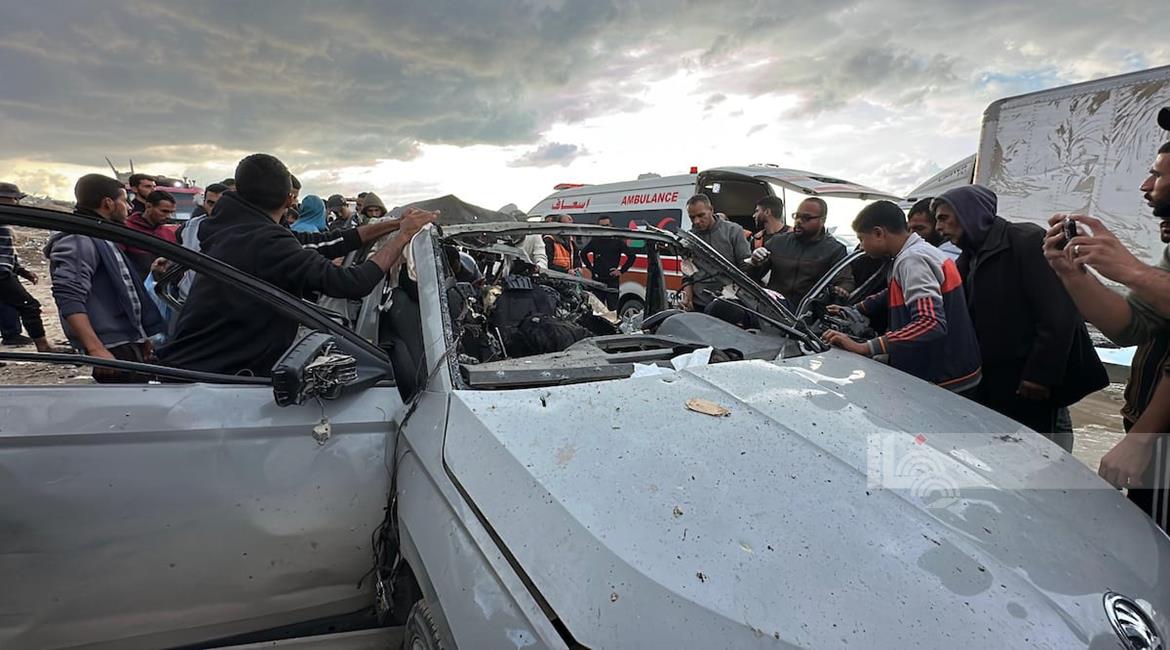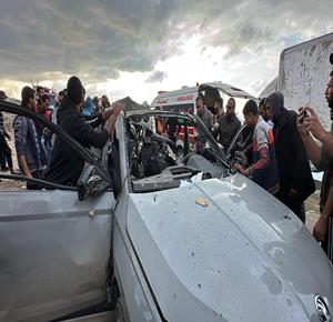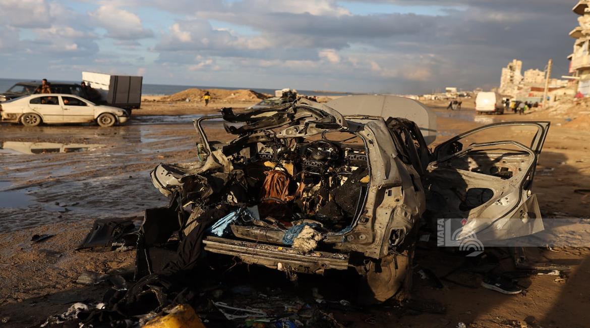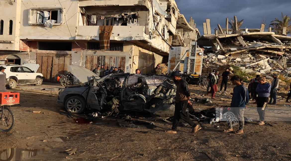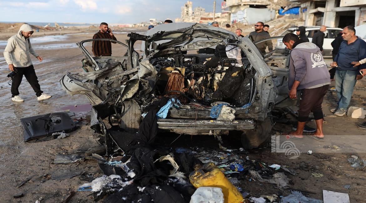 غزة - مواطنون يتفقدون مركبة تعرضت لقصف إسرائيلي في مدينة غزة أسفر عن ارتقاء شهداء وجرحى