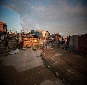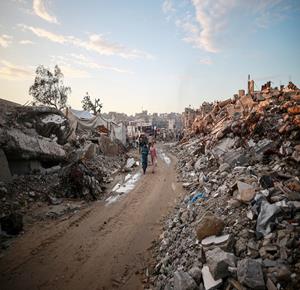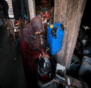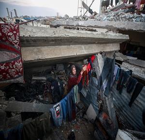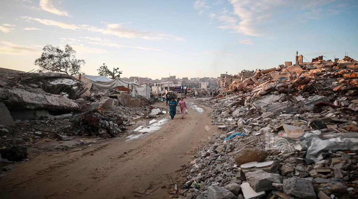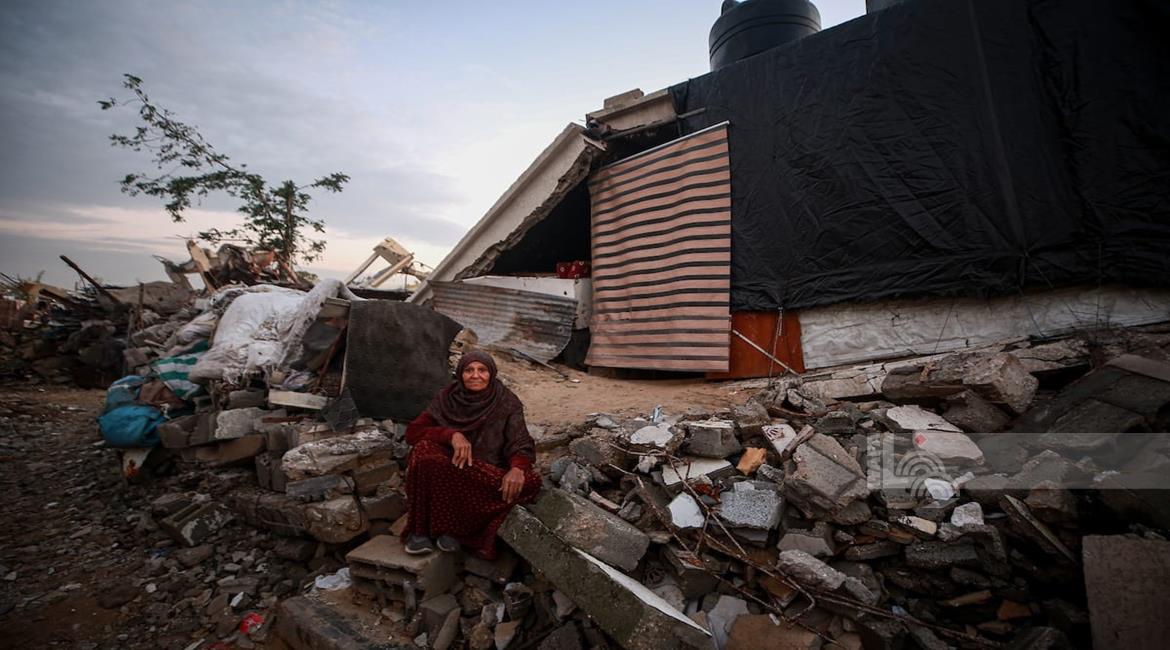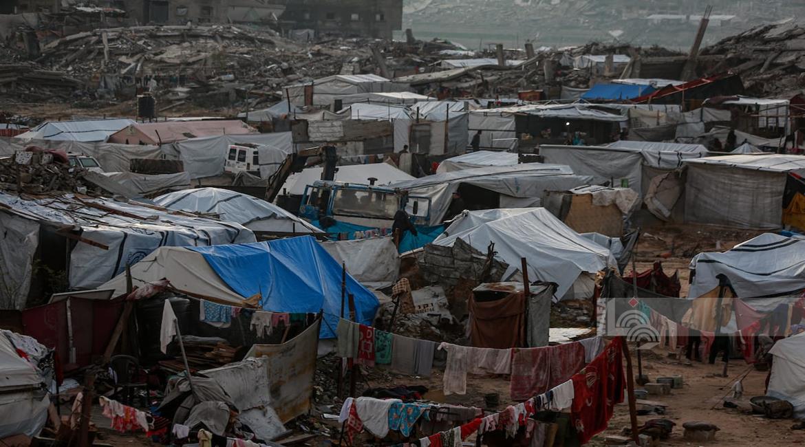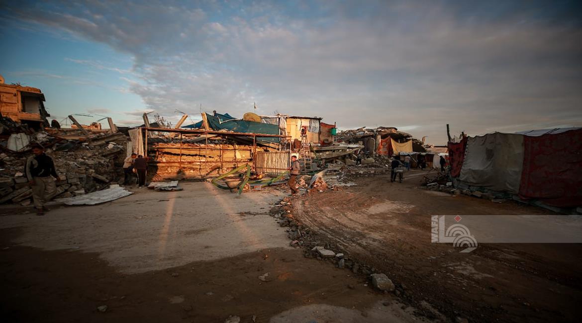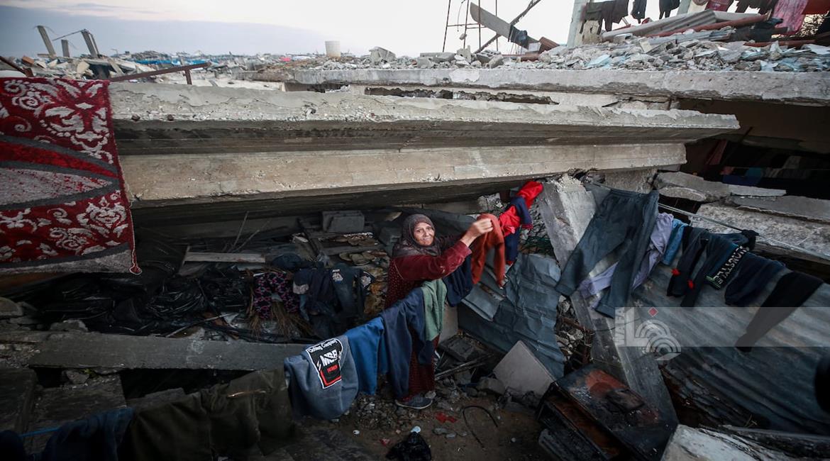 غزة - مواطنون يتخذون من مبانٍ مدمرة ملجأ لهم نتيجة الظروف الجوية الصعبة وغرق خيامهم في جباليا شمال غزة