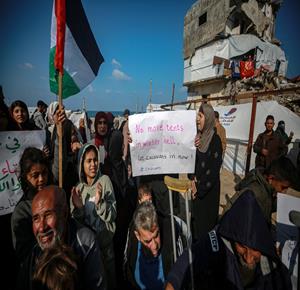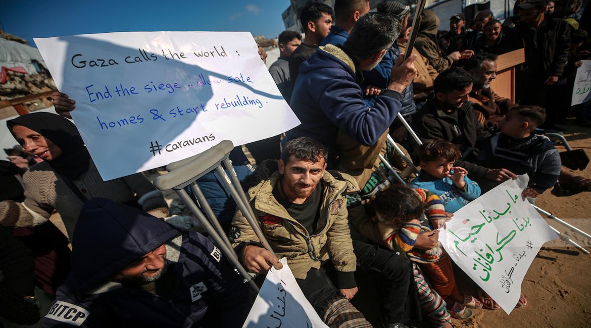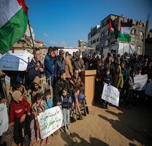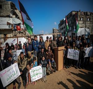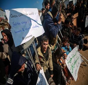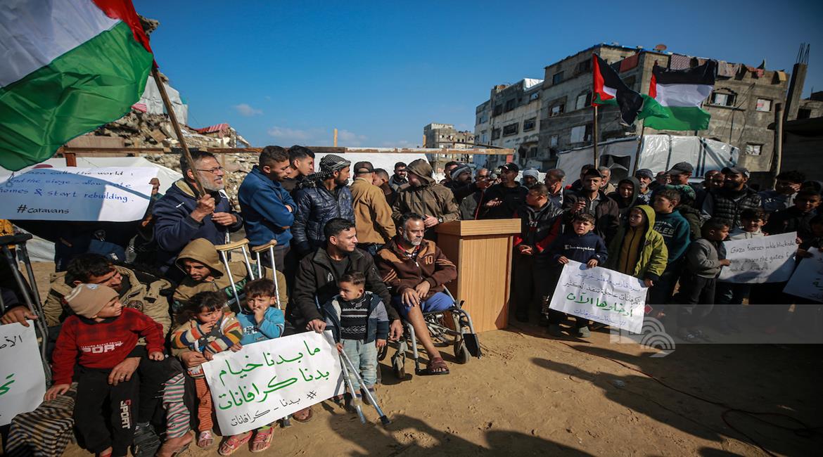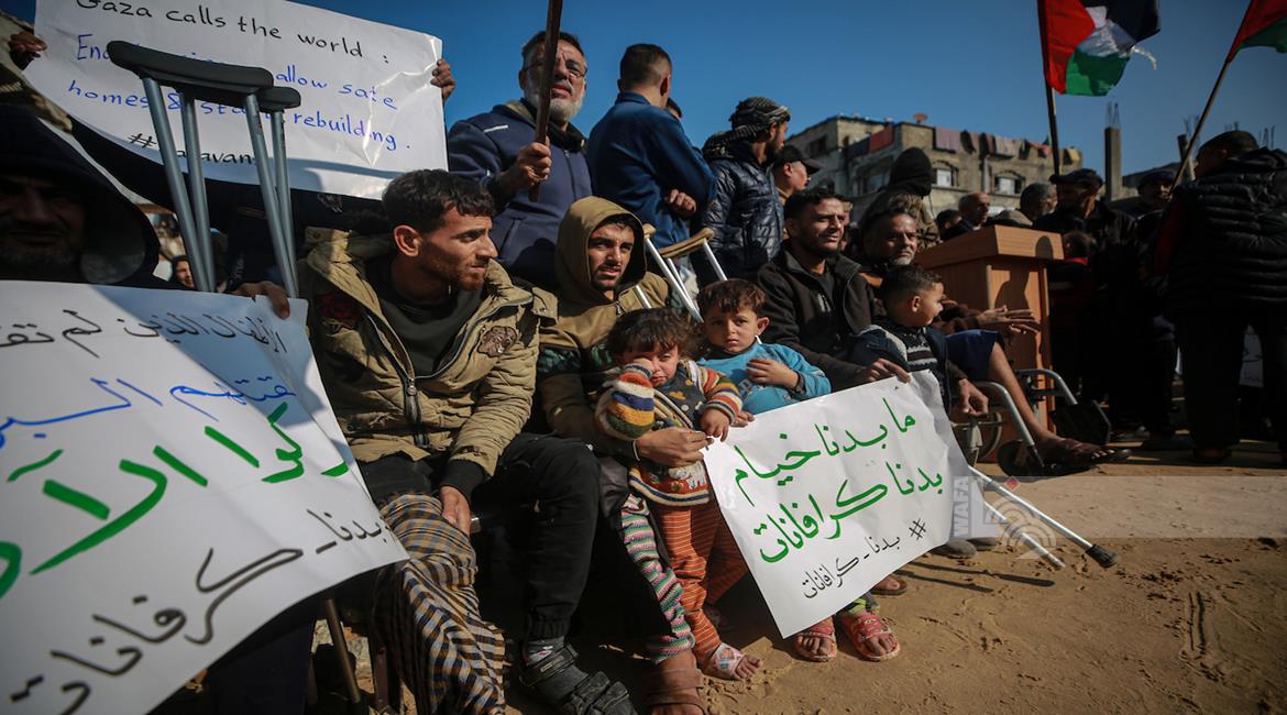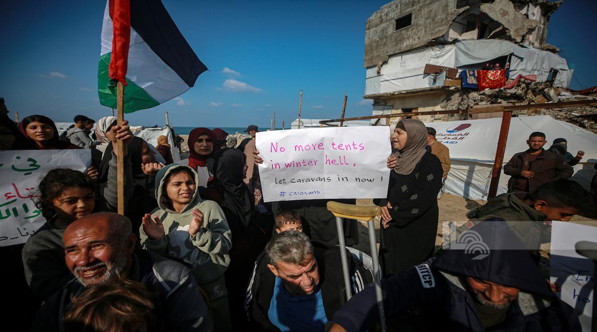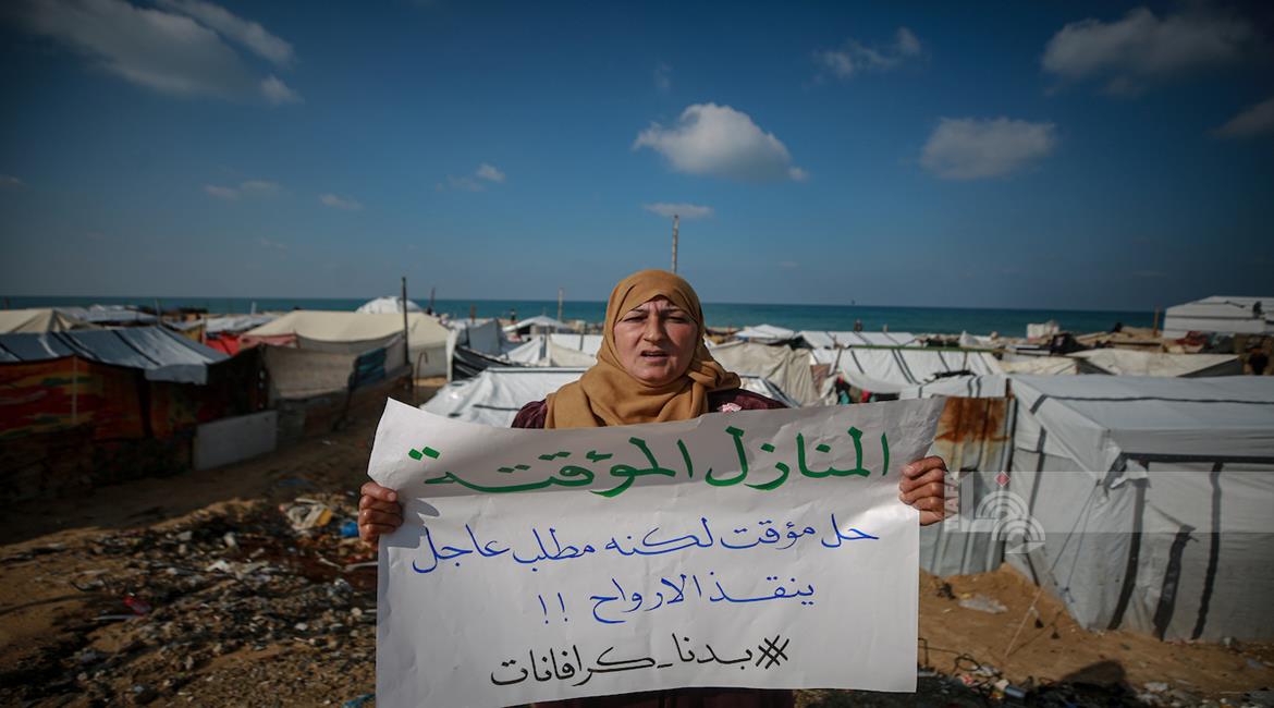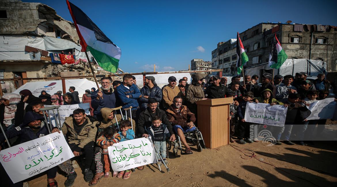 غزة - نازحون ينظمون وقف احتجاجية بمدينة غزة يطالبون فيها بتعجيل الإعمار وإدخال "البيوت المتنقلة" بدلاً من الخيام التي لا تصلح للسكن في ظل المنخفضات الجوية التي تضرب قطاع غزة