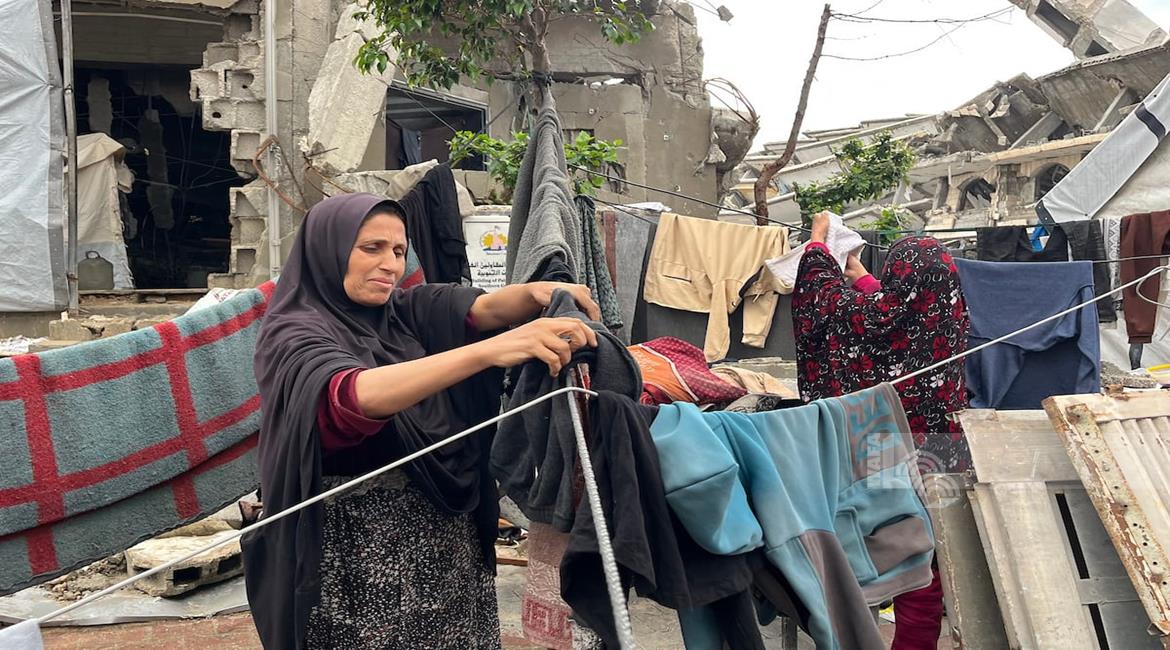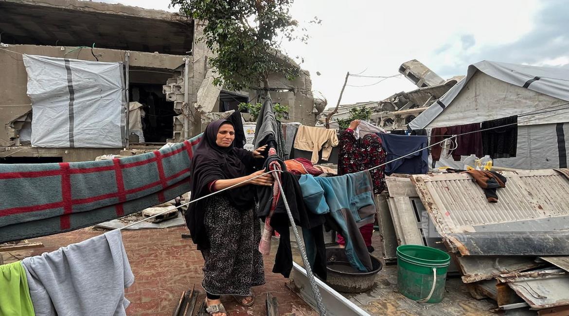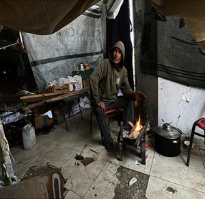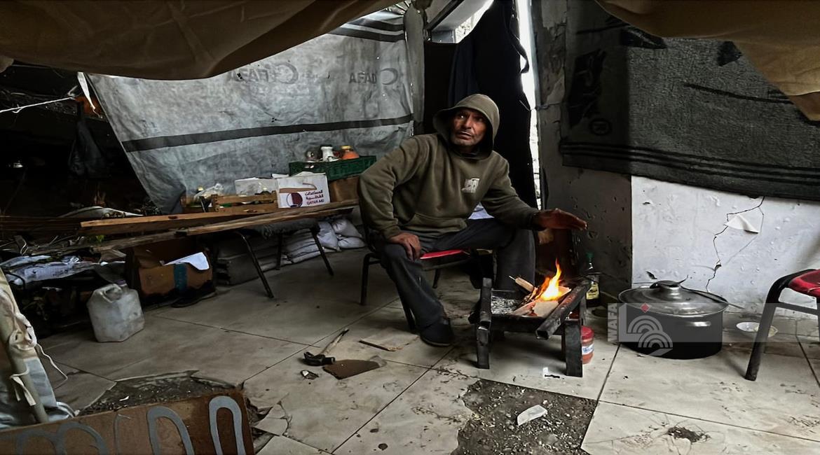 عائلة تحتمي من برد الشتاء القارس في خيمة نصبتها فوق منزلها المدمر قرب الخط الأصفر في خان يونس، جنوب قطاع غزة