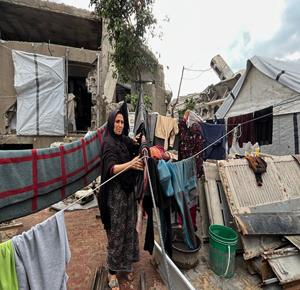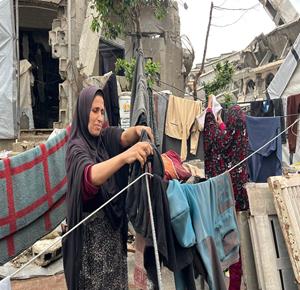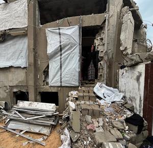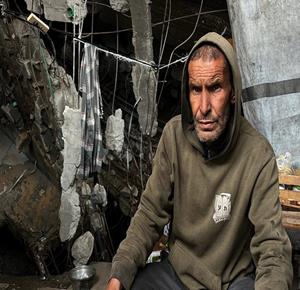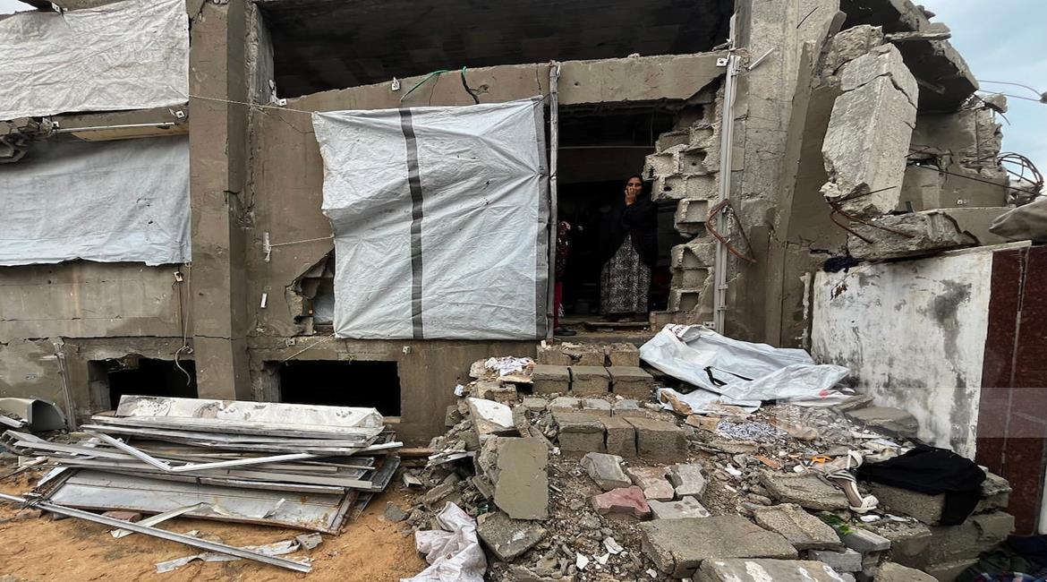 غزة - الزوجان أشرف وشادية السرساوي وأطفالهم يحتمون من المطر وبرد الشتاء في بيت مدمّر آيل للسقوط في مدينة غزة