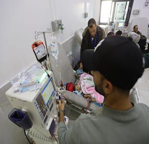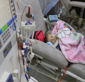 غزة - الطفلة سما أبو عجوة المصابة بمرض نادر، تتلقى الرعاية الطبية المحدودة في مستشفى الشفاء بمدينة غزة وسط نقص حاد في الأدوية بسبب إغلاق المعابر