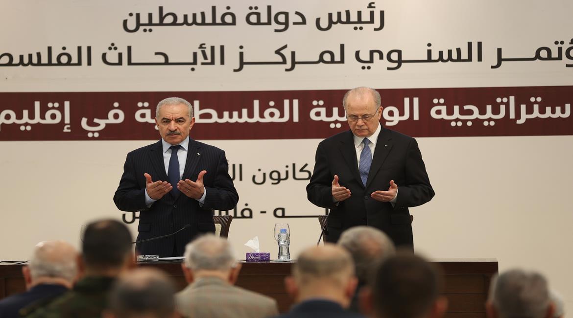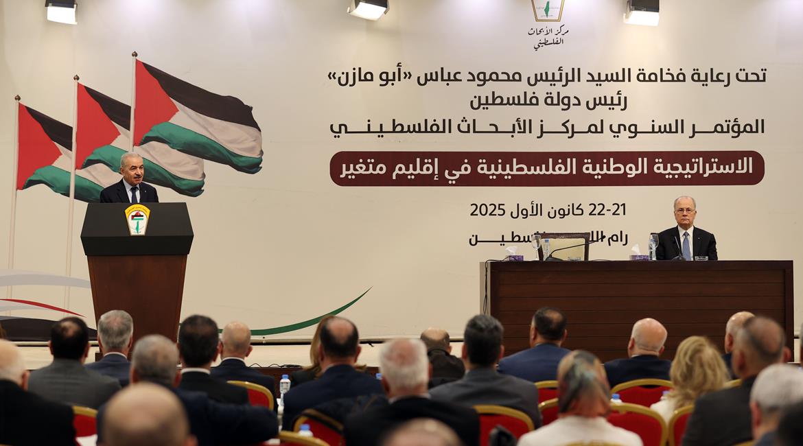 رام الله - ممثلا عن الرئيس محمود عباس، رئيس الوزراء محمد مصطفى خلال مشاركته في افتتاح المؤتمر السنوي لمركز الأبحاث الفلسطيني 2025