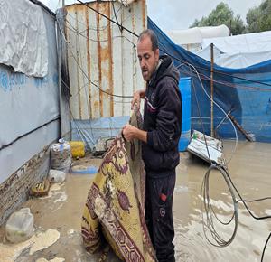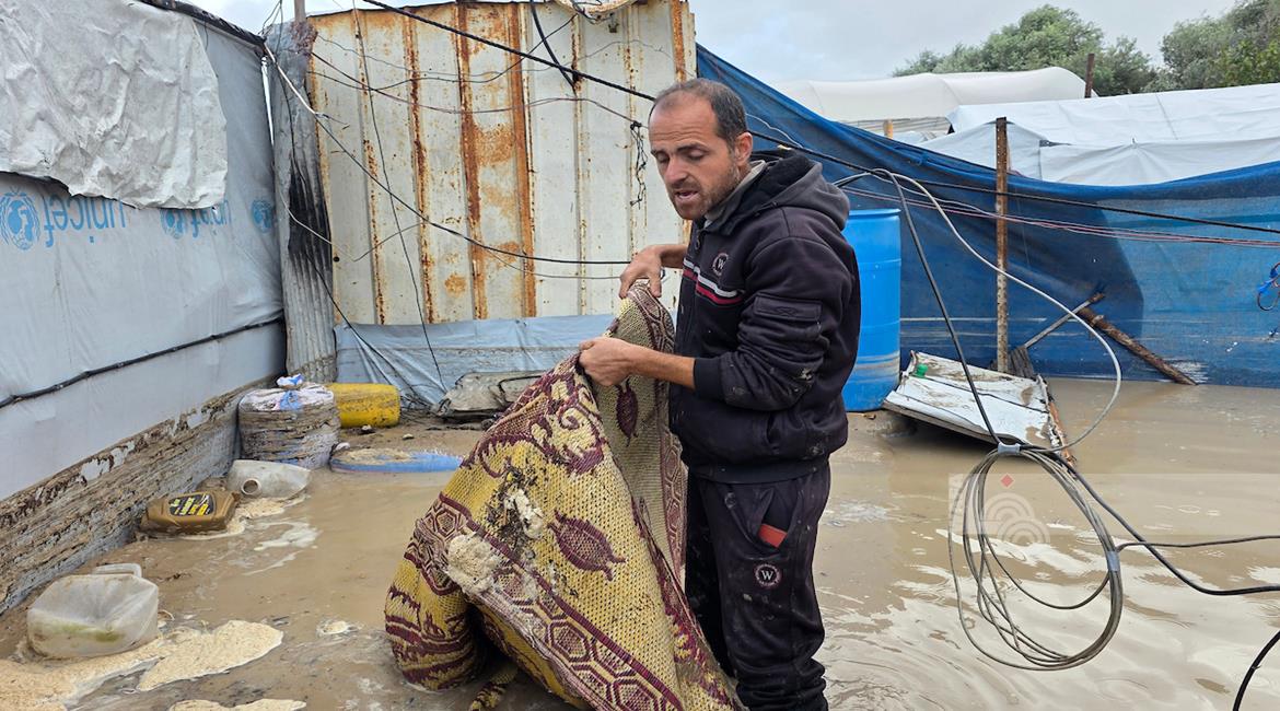 الجريح أحمد أبو ليلى يعيش في ظروف إنسانية صعبة مع زوجته وأطفاله الخمسة في مخيمات النزوح، بعد تضرر خيمته جراء الأمطار الغزيرة والرياح العاتية التي اجتاحت مخيم النصيرات وسط قطاع غزة