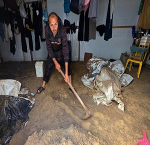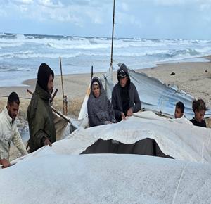 غزة - نازحون يحاولون إصلاح خيامهم التي تضررت بفعل مياه الأمطار والرياح القوية في منطقة المواسي، غرب خان يونس