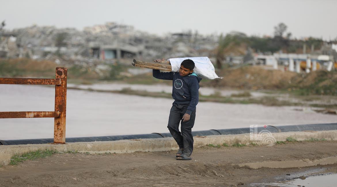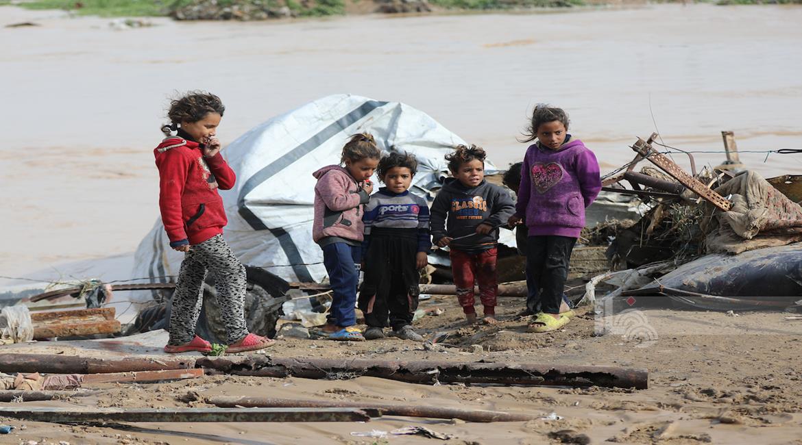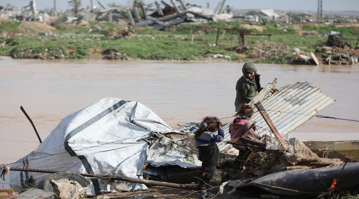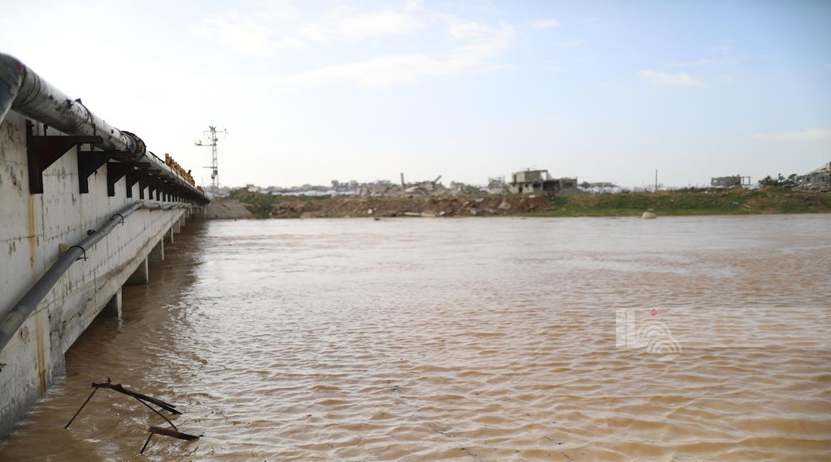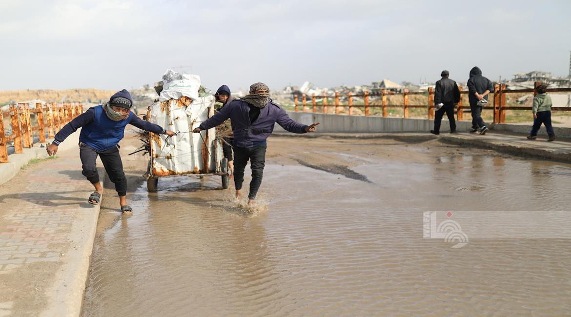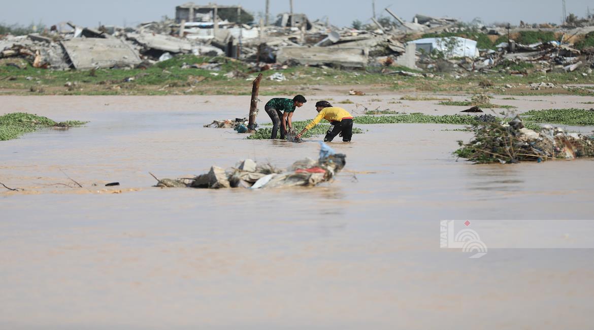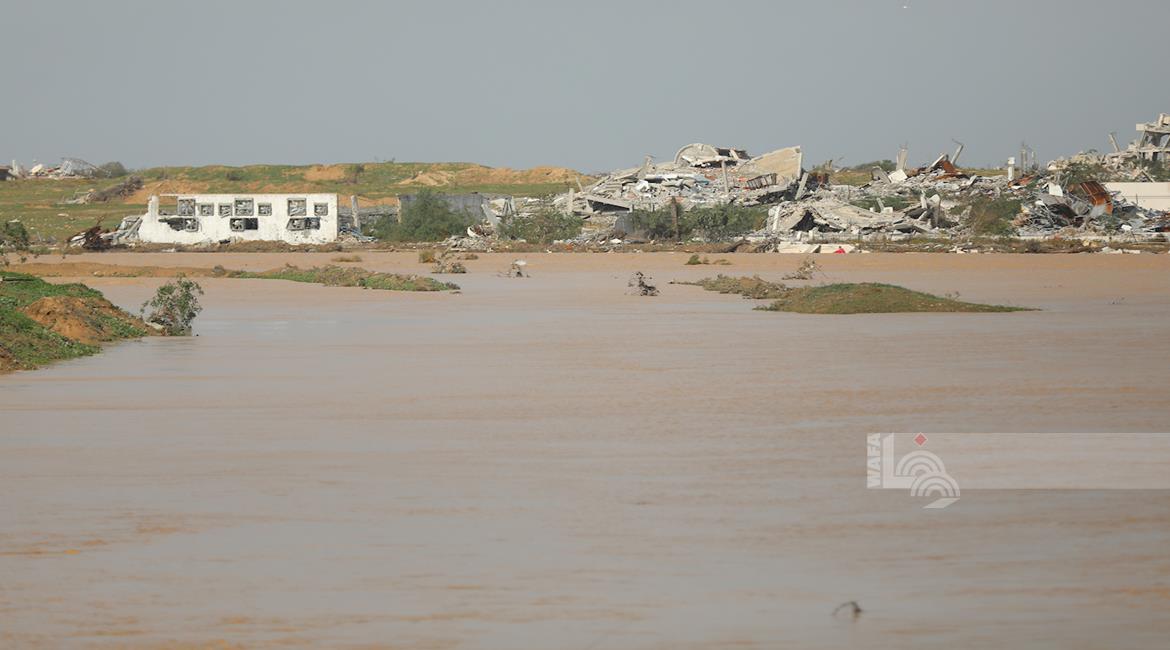 غزة - فيضان المياه في وادي غزة بفعل الاحتلال يزيد من معاناة العائلات النازحة التي كانت تقيم في خيامها قرب منطقة الوادي
