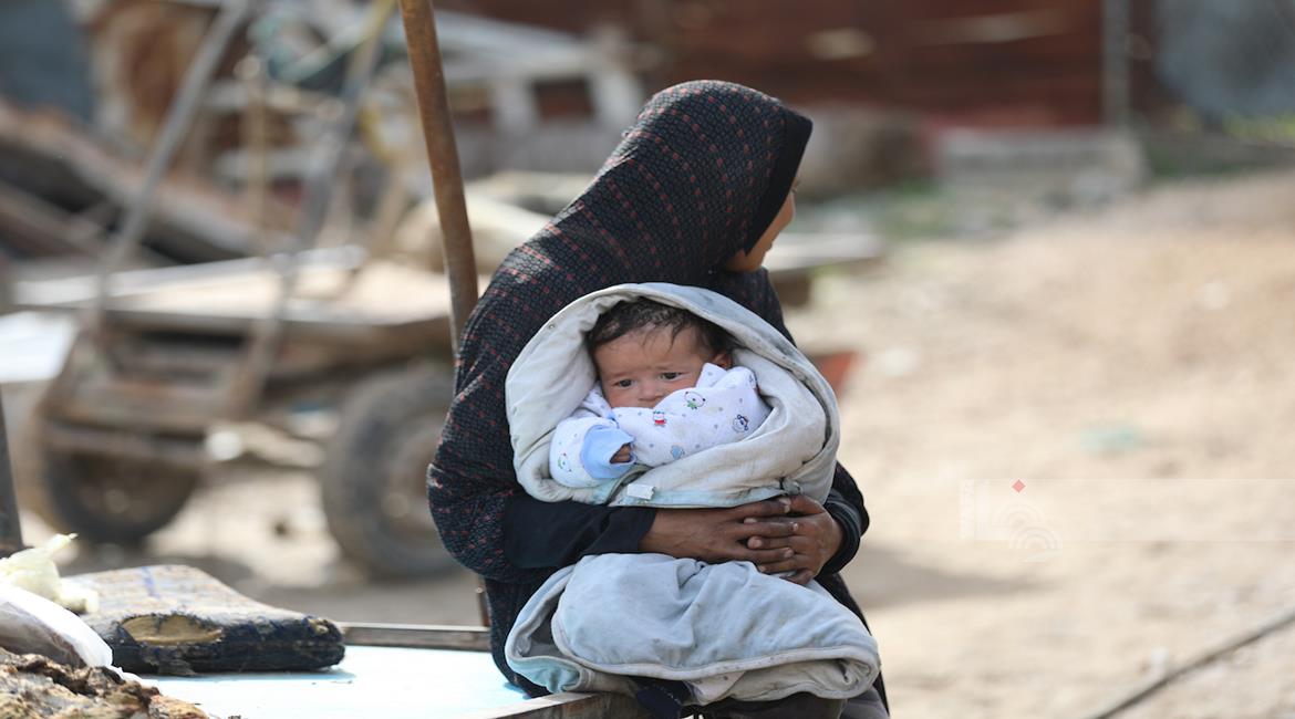 عائلة نازحة تكافح وسط ظروف غير إنسانية من أجل حماية أطفالها الأربعة من أجواء الشتاء القارس في خيام النزوح بملعب اليرموك في مدينة غزة