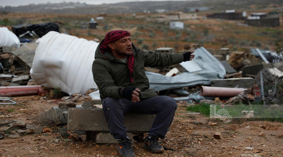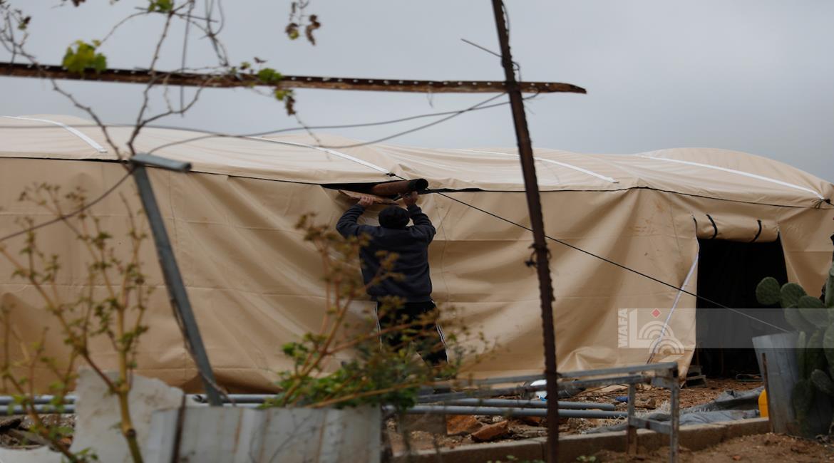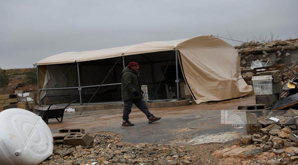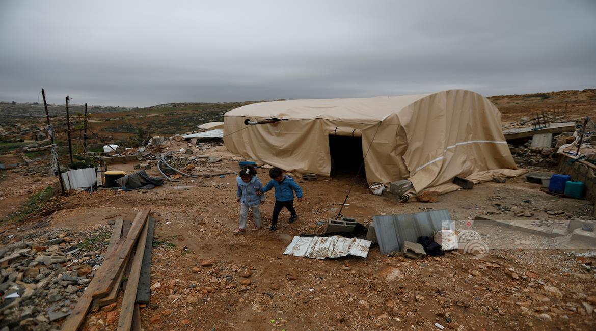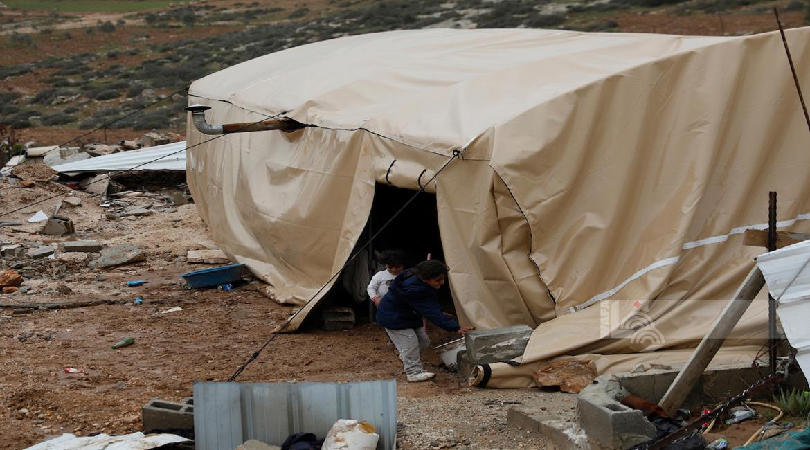 الخليل - مياه الأمطار تغمر خيمة عائلة حرب التي أقامتها على أنقاض منزلهم الذي هدمه جيش الاحتلال في 9 ديسمبر، في منطقة خلات الفرا، غرب يطا، جنوب الخليل.