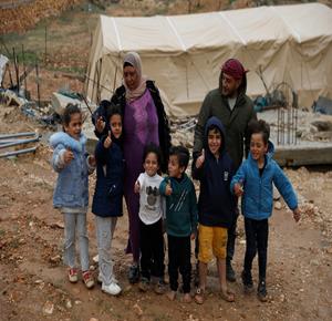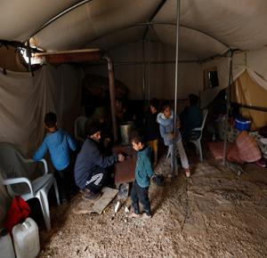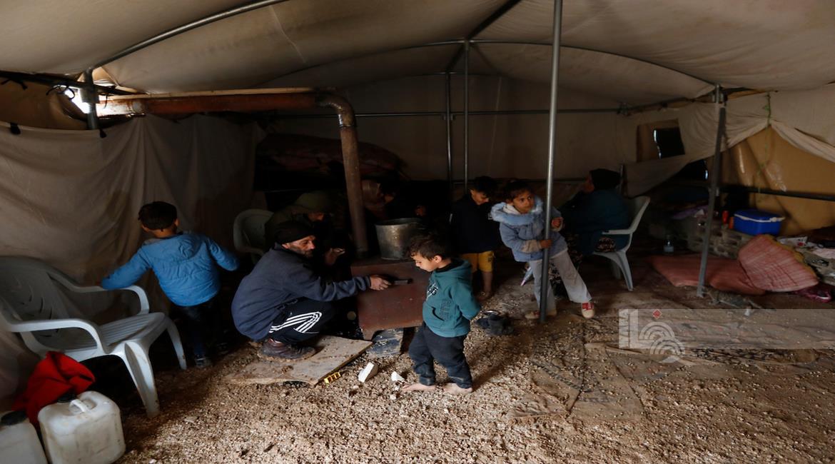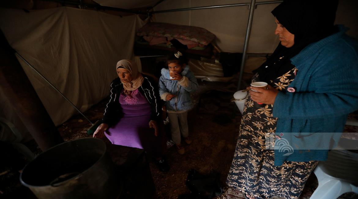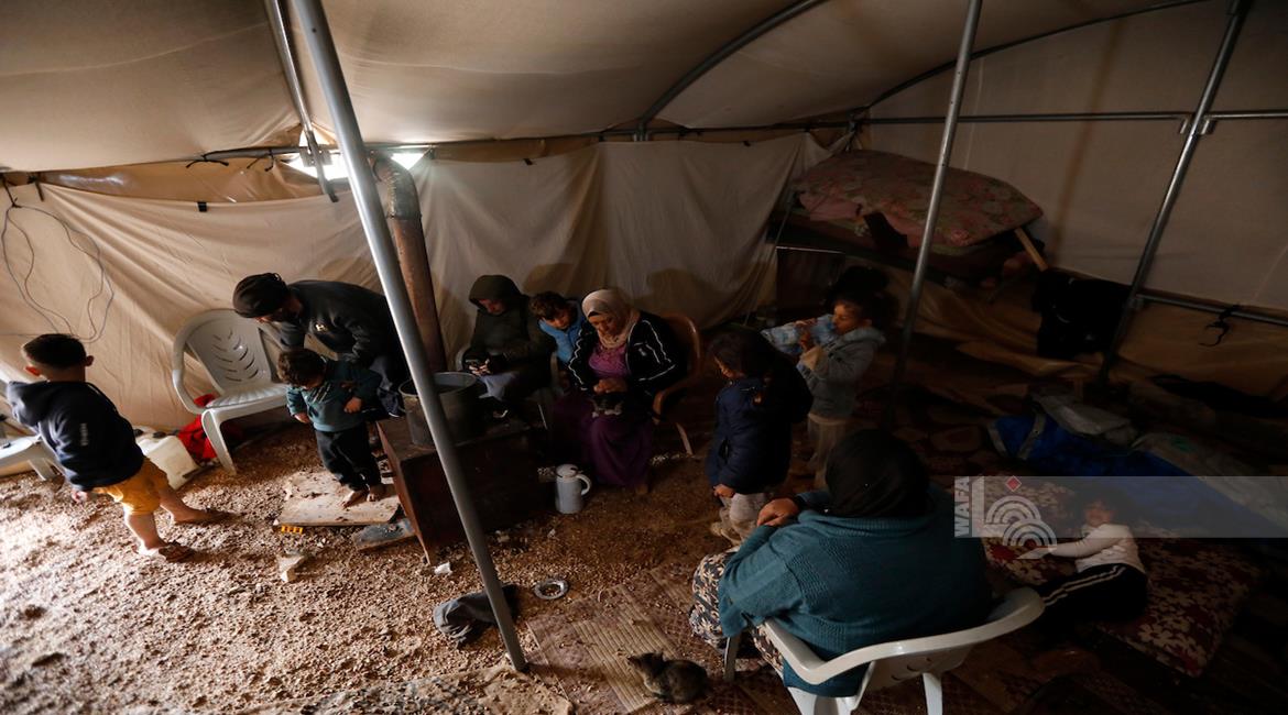 عائلة نازحة تكافح وسط ظروف غير إنسانية من أجل حماية أطفالها الأربعة من أجواء الشتاء القارس في خيام النزوح بملعب اليرموك في مدينة غزة