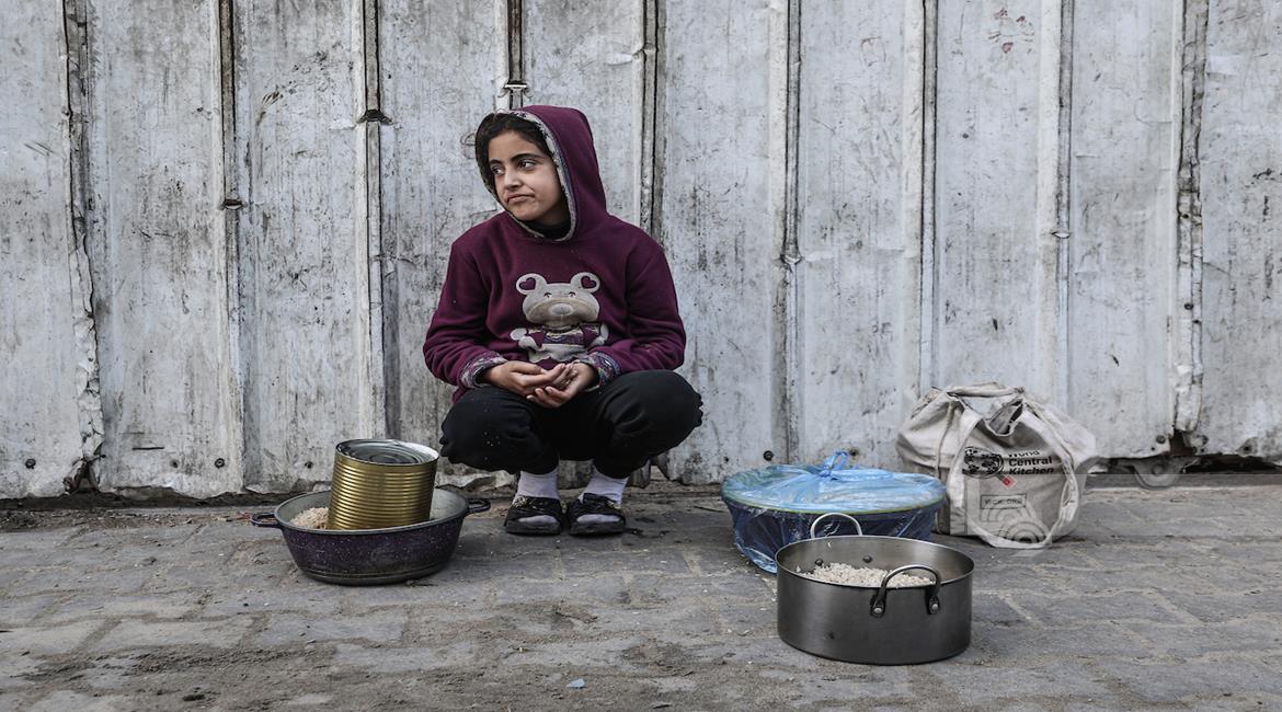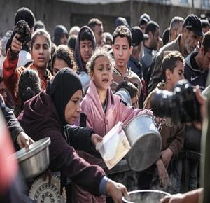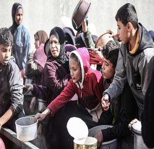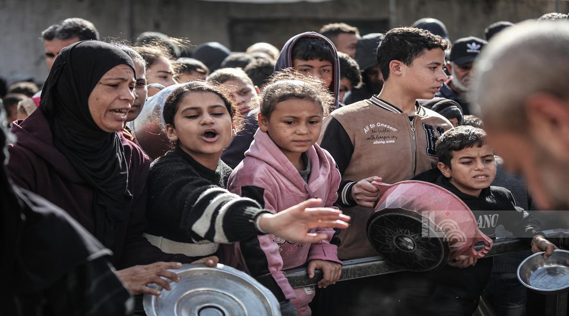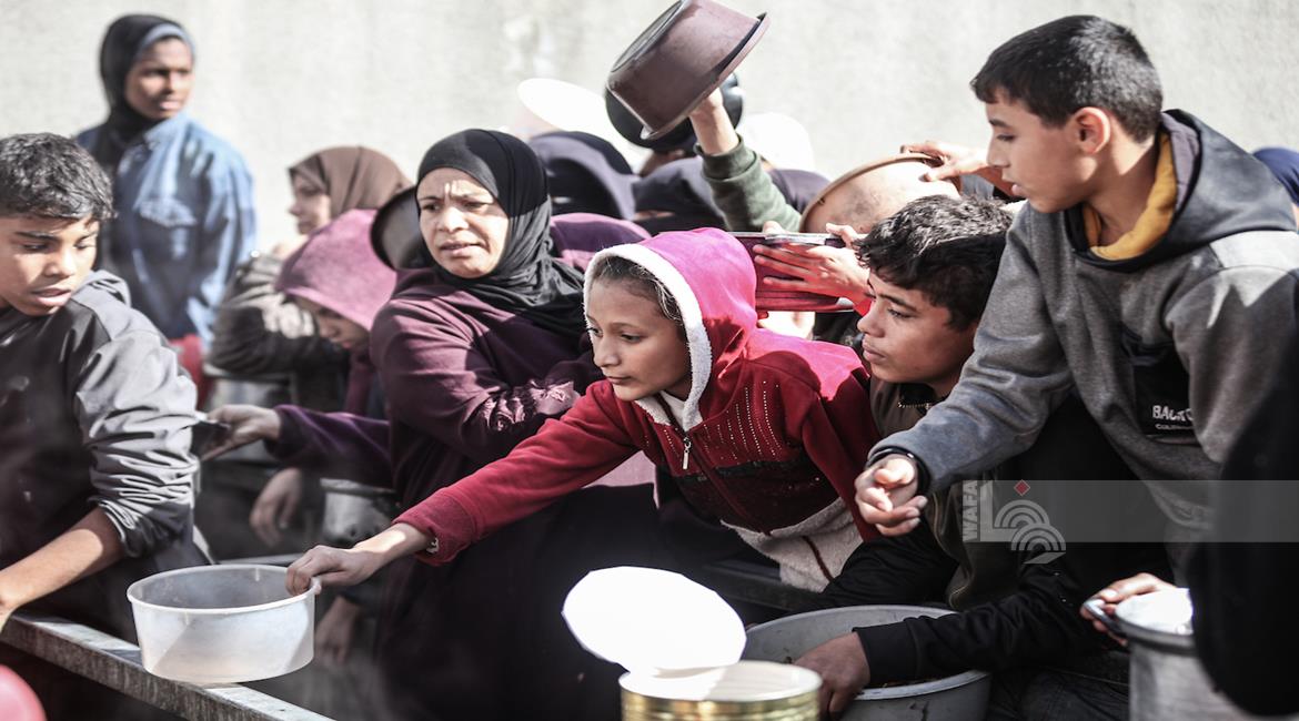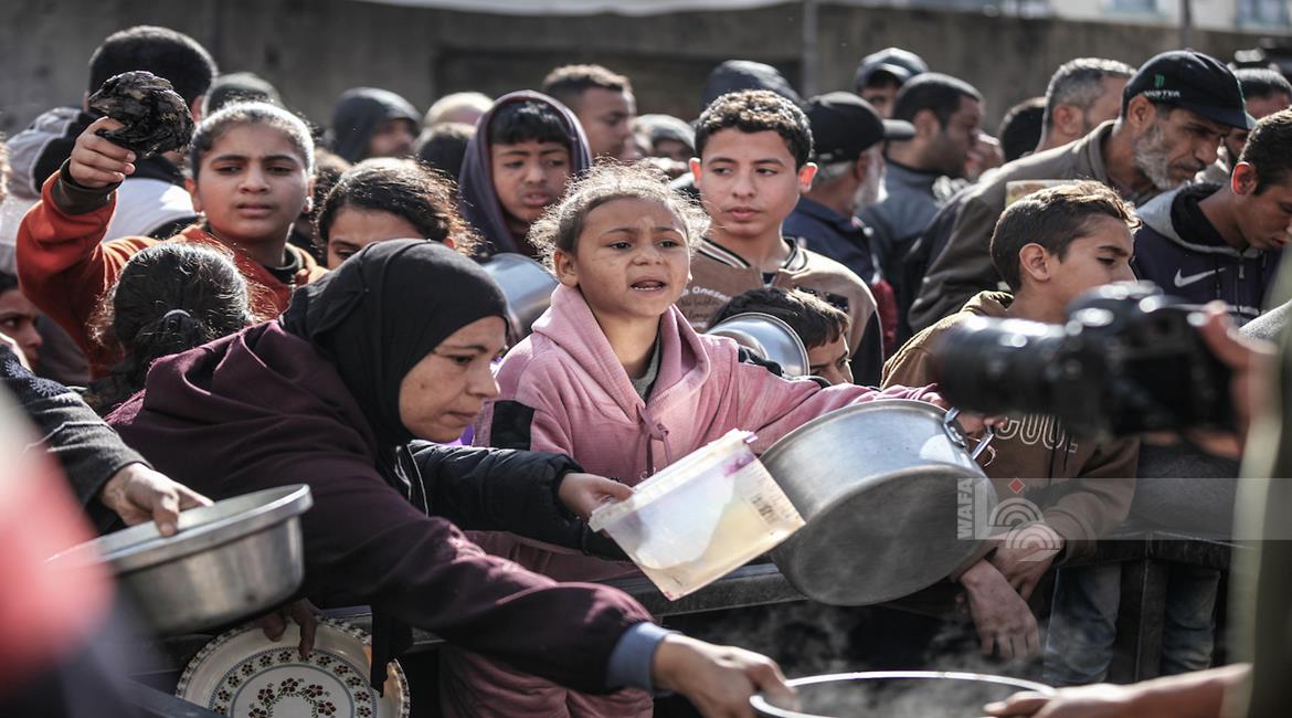 غزة - مواطنون يتجمعون في طوابير طويلة لتلقي وجبات ساخنة من تكية خيرية في مخيم النصيرات، وسط قطاع غزة
