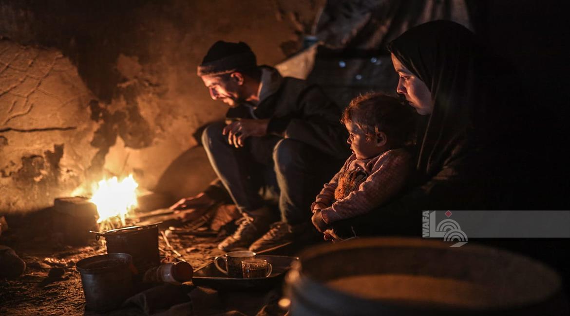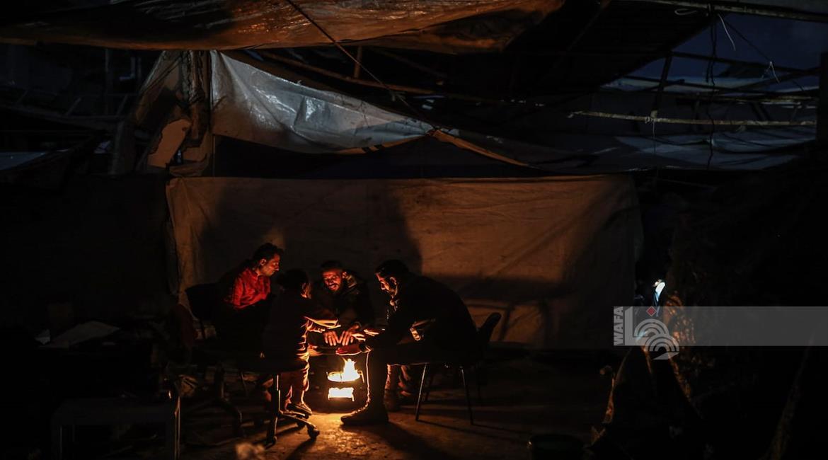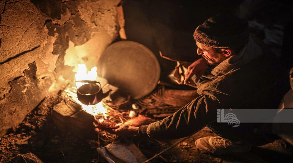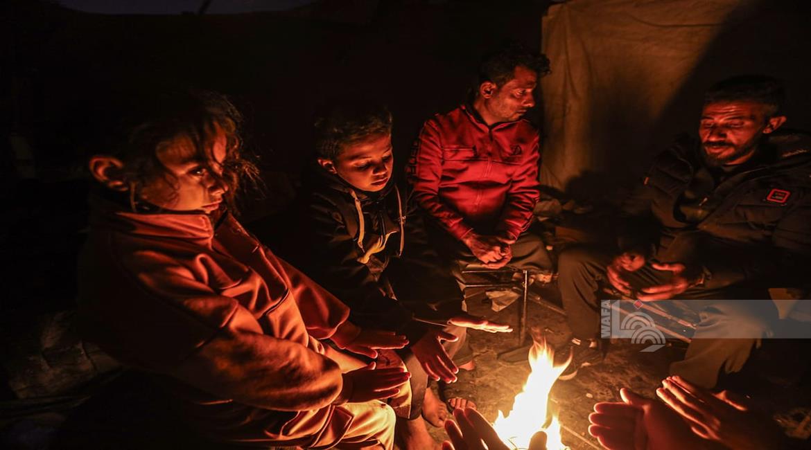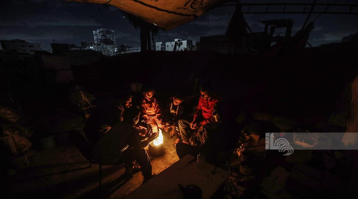 غزة - عائلات نازحة تتجمع حول النار للتدفئة في مدينة غزة في ظل الأجواء الباردة