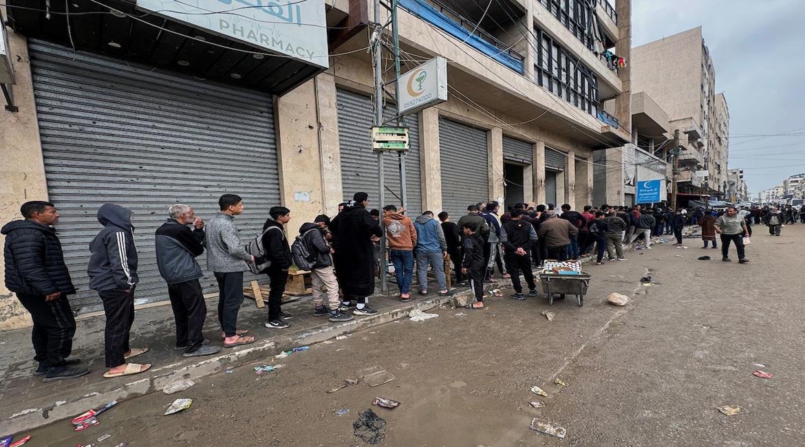 مواطنون يصطفون في طوابير طويلة للحصول على الخبز من نقطة بيع في شارع الوحدة بمدينة غزة، في ظل نقص حاد في المساعدات وشح الوقود والمواد الأساسية