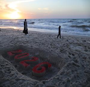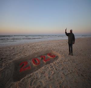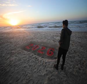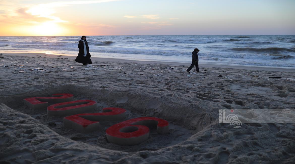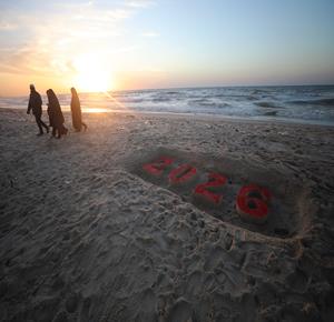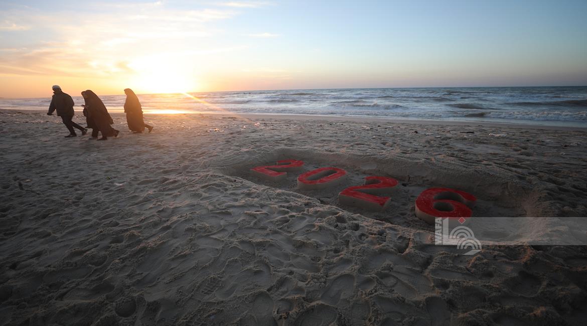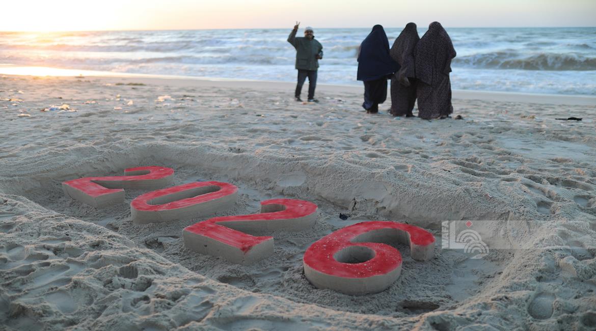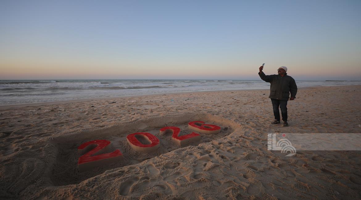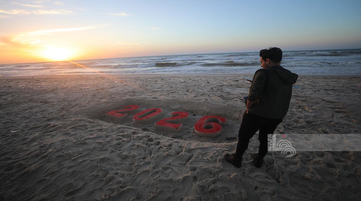 غزة - غزيّون يودعون عام 2025 بكتابة 2026 على رمال شاطئ غزة