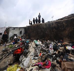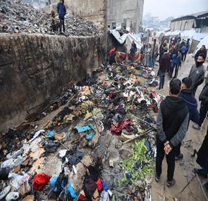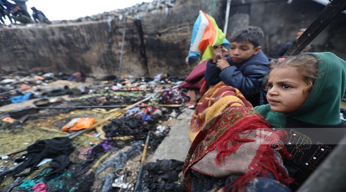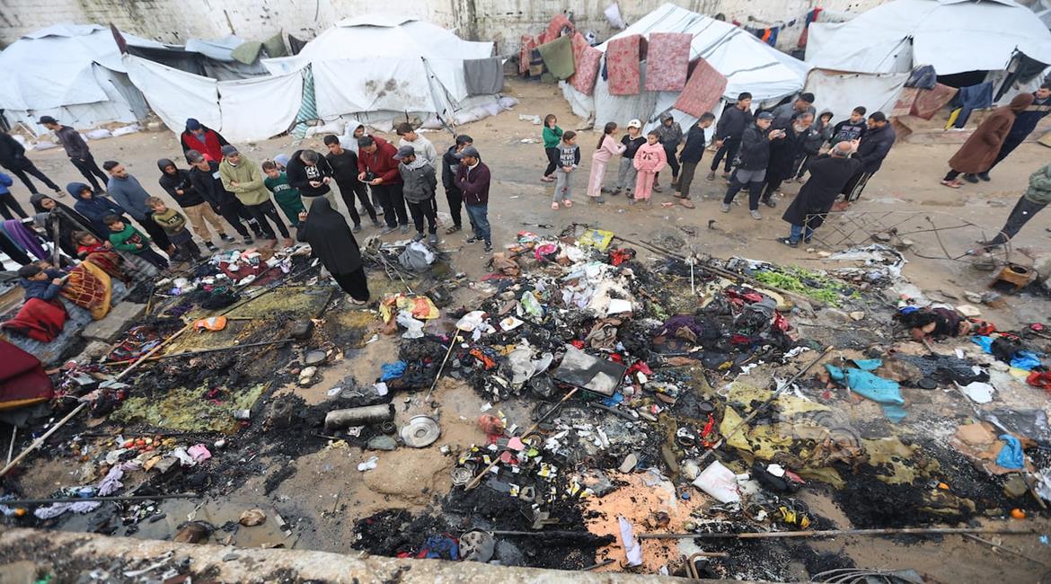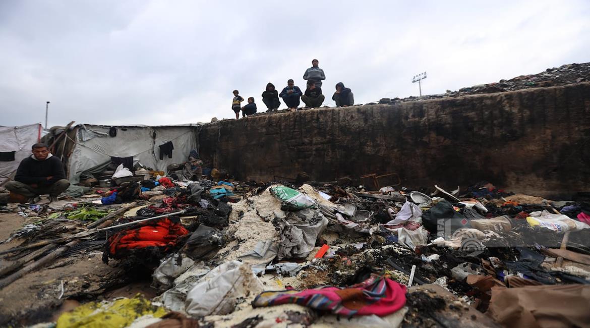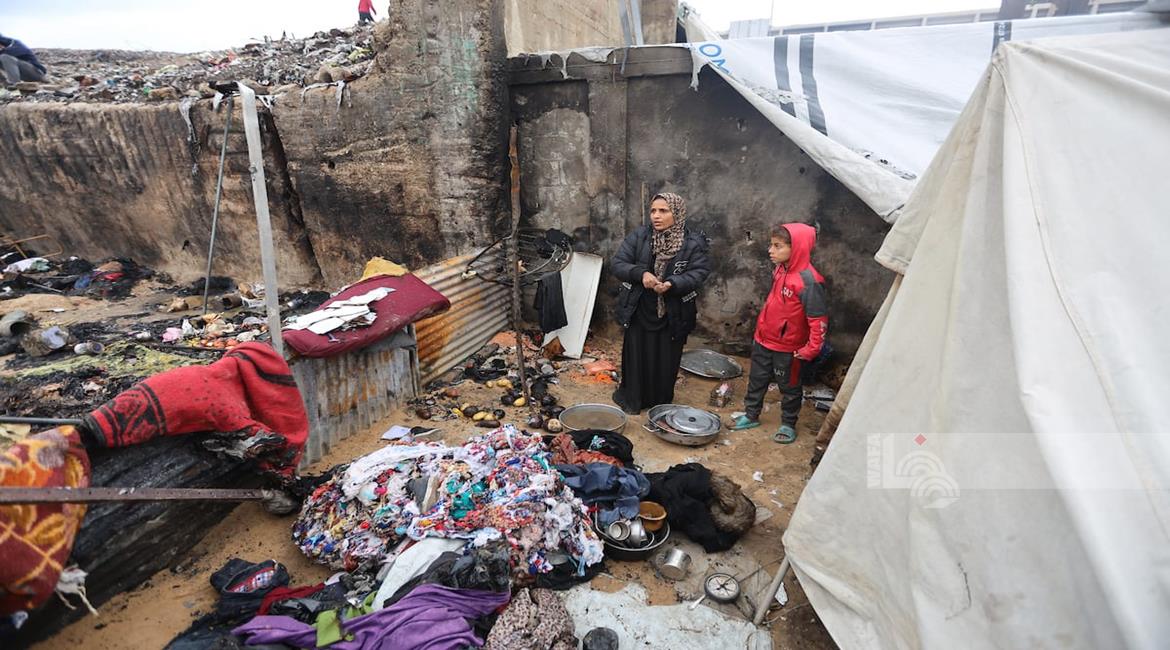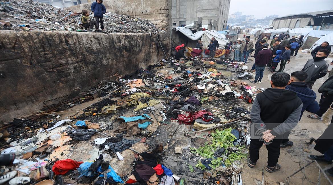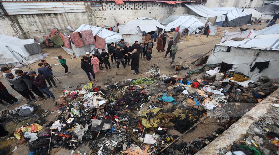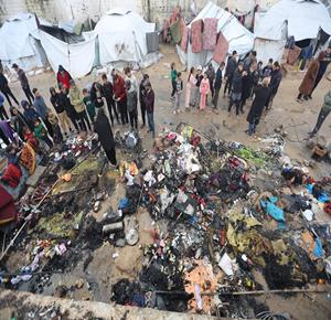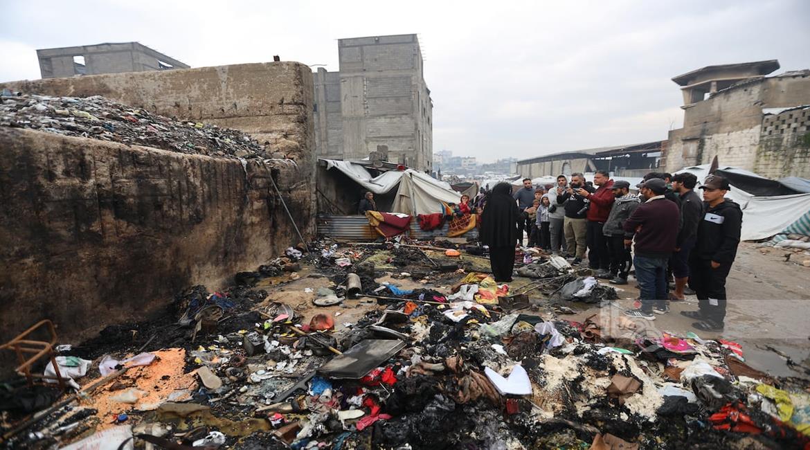 غزة - مواطنون يتفقدون بقايا خيمة النازحة أمل أبو الخير بعد اندلاع حريق فيها ليلا داخل مخيم اليرموك في مدينة غزة، الذي أسفر عن استشهادها وحفيدها الطفل سعود محمد أبو الخير (5 أعوام)