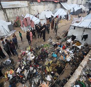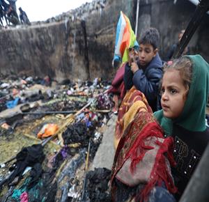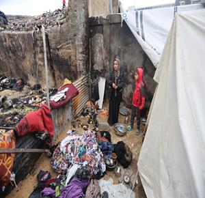 نازحون يعانون من موجة البرد والأمطار الغزيرة التي تسببت في تشكّل تجمعات مائية واسعة وغمرت خيامهم في مخيم البريج وسط قطاع غزة