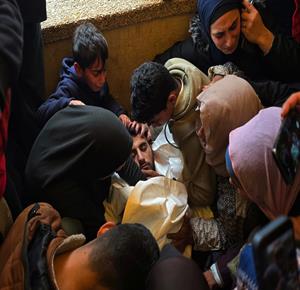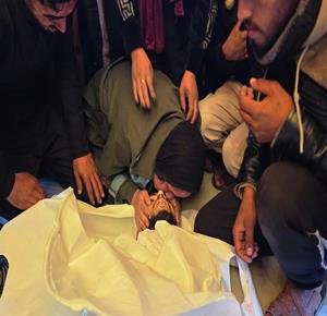 وداع الشهيدة أمل أبو الخير وحفيدها الطفل سعود (5 سنوات)، إثر حريق اندلع ليلا في خيمتهما بمخيم اليرموك للنازحين
