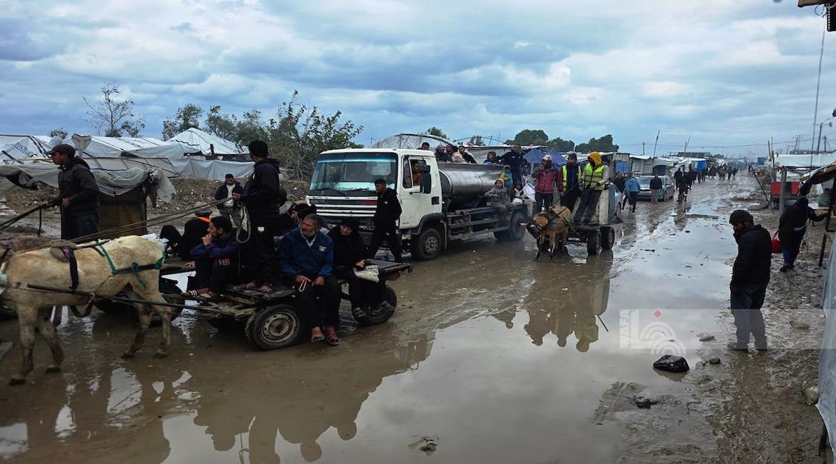 نازحون يعانون من موجة البرد والأمطار الغزيرة التي تسببت في تشكّل تجمعات مائية واسعة وغمرت خيامهم في مخيم البريج وسط قطاع غزة