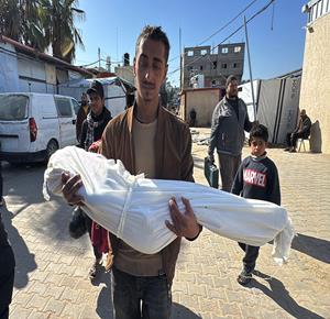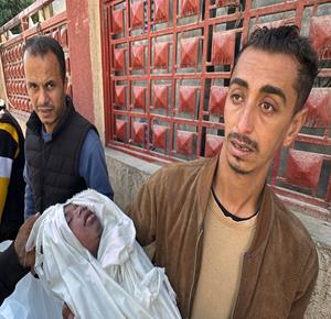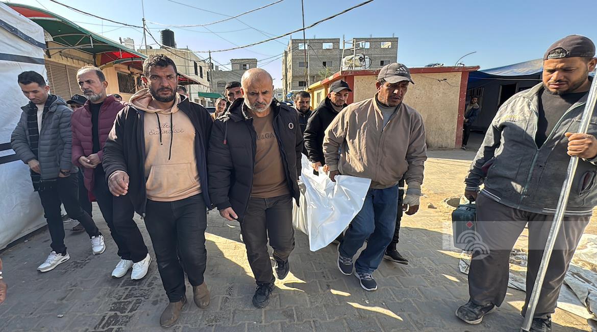 وصول شهيدين، أحدهما طفلة، إلى مستشفى ناصر الطبي بعد أن ارتقوا في قصف إسرائيلي طال خيمة تُؤوي نازحين في منطقة المواصي غرب خان يونس