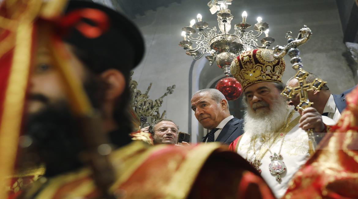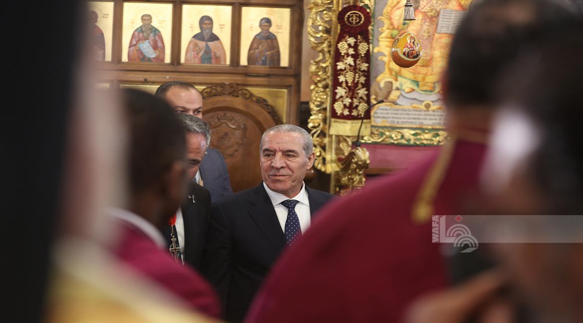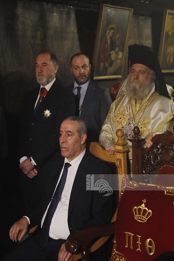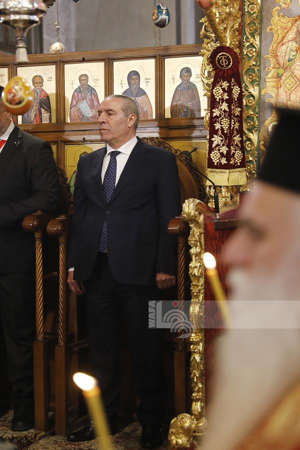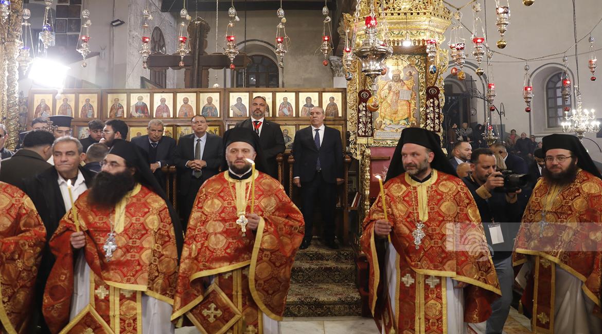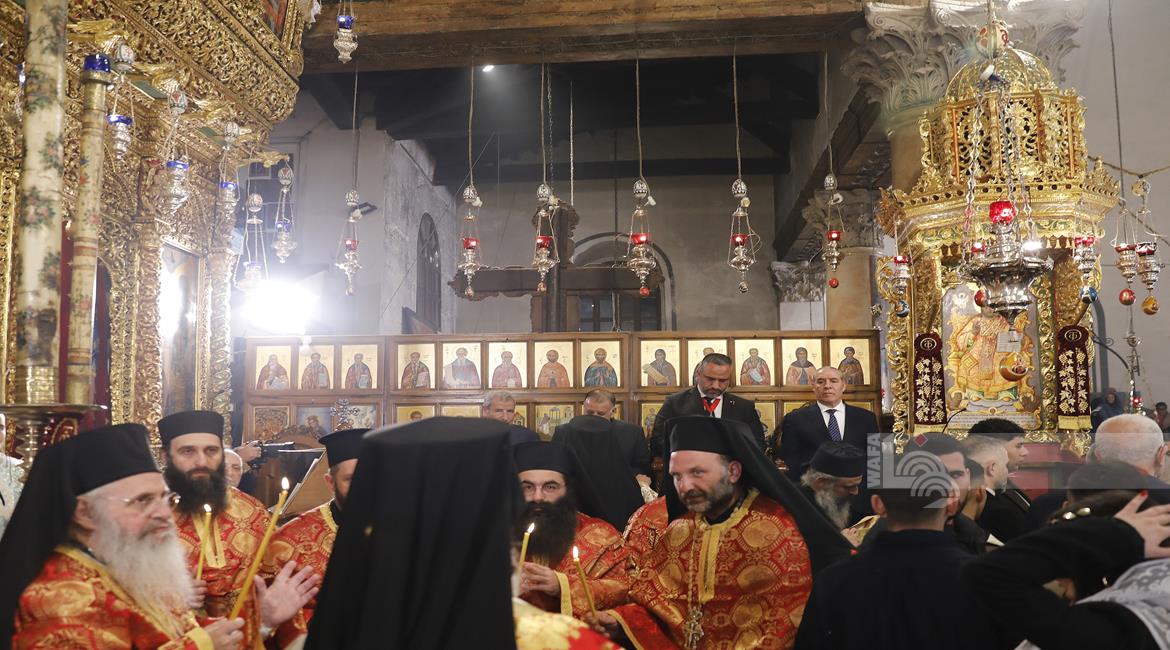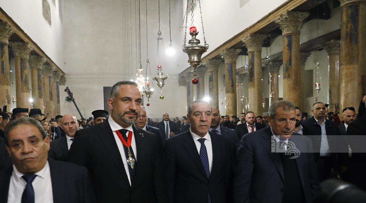 بيت لحم - ممثلا عن رئيس دولة فلسطين محمود عباس، نائب الرئيس حسين الشيخ يحضر قداس منتصف الليل بمناسبة عيد الميلاد المجيد للكنائس المسيحية التي تسير وفق التقويم الشرقي.