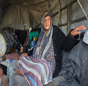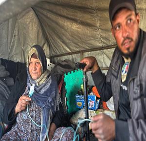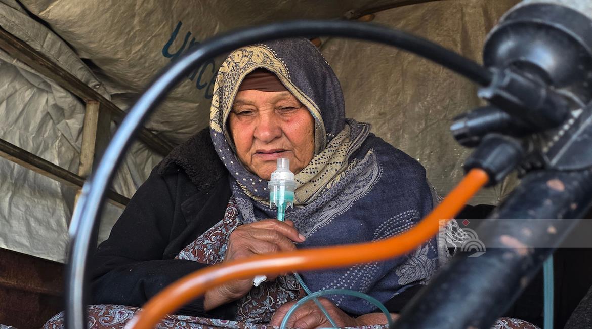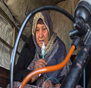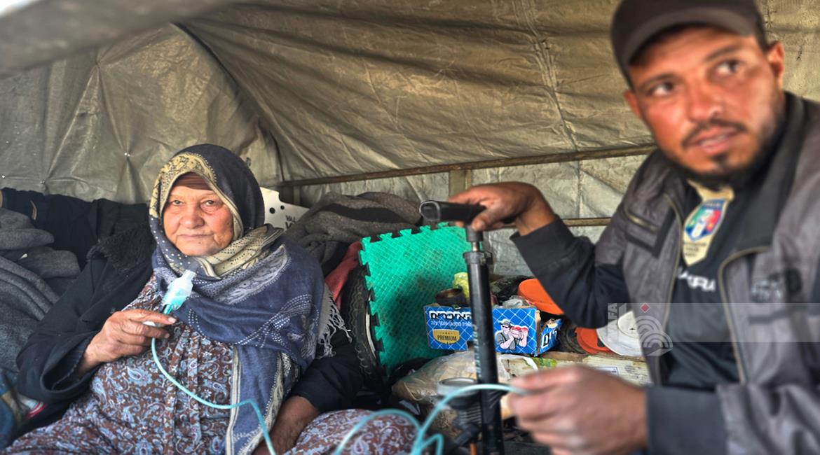 غزة - سامي أبو سعادة ووالدته يعيشان داخل عربة جرّار في خان يونس، يضطر سامي إلى استخدام مضخة نفخ مطاطية لمساعدة والدته على التنفّس، نظرا لمعاناتها من مشاكل حادة في الجهاز التنفسي