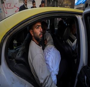 وصول شهيدين، أحدهما طفلة، إلى مستشفى ناصر الطبي بعد أن ارتقوا في قصف إسرائيلي طال خيمة تُؤوي نازحين في منطقة المواصي غرب خان يونس