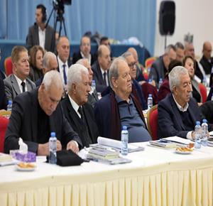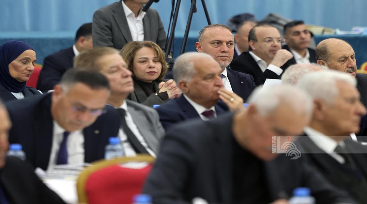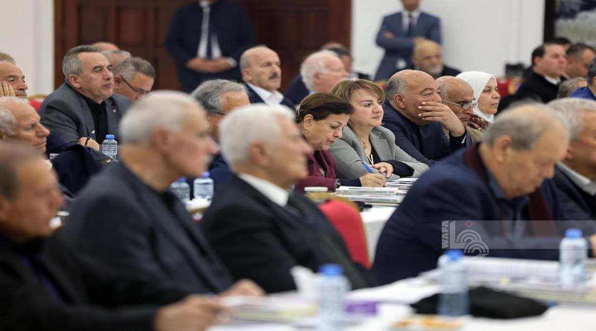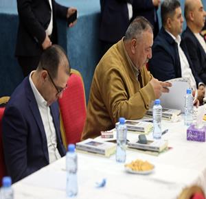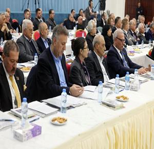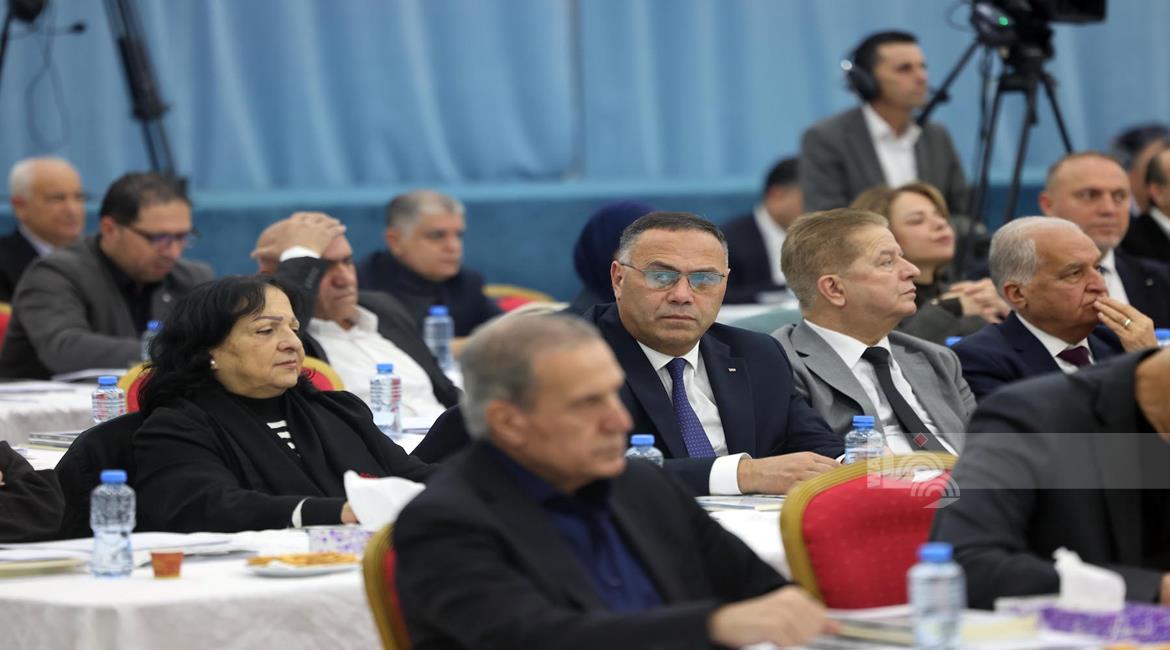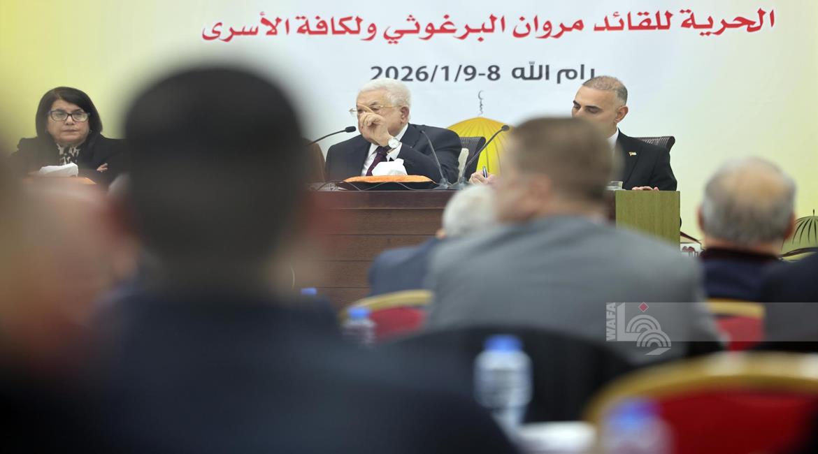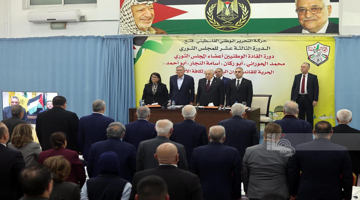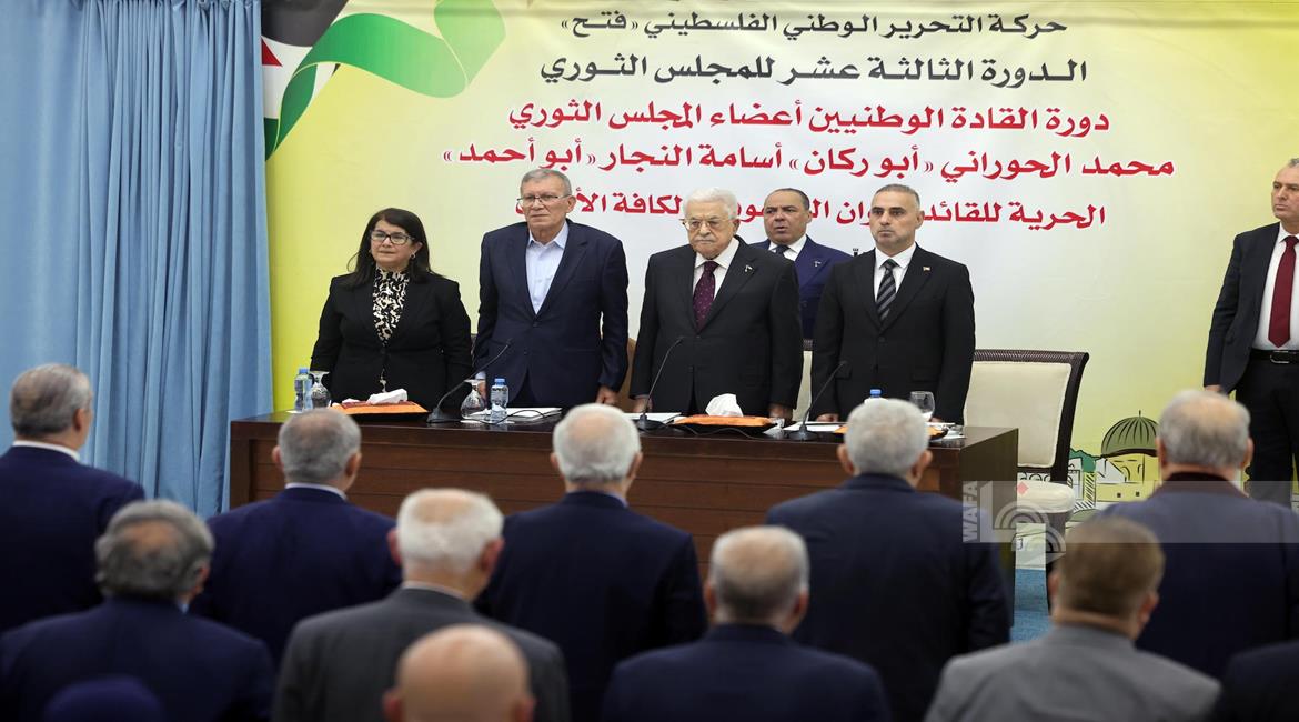 رام الله - الرئيس محمود عباس، خلال ترؤسه الجلسة الافتتاحية للدورة الثالثة عشر للمجلس الثوري لحركة "فتح"، "دورة القادة الوطنيين محمد الحوراني، أسامة النجار، الحرية للقائد مروان البرغوثي ولكافة الأسرى"