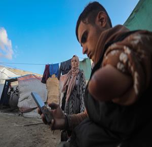 الطفلة النازحة سارة سعدة (14 عامًا) تمارس شغفها الفني بالرسم في خيمتها بمدينة غزة. وتحاول سارة التعبير عن معاناة أهالي قطاع غزة وإيصال صوتهم إلى العالم، من خلال لوحاتها الفنية.