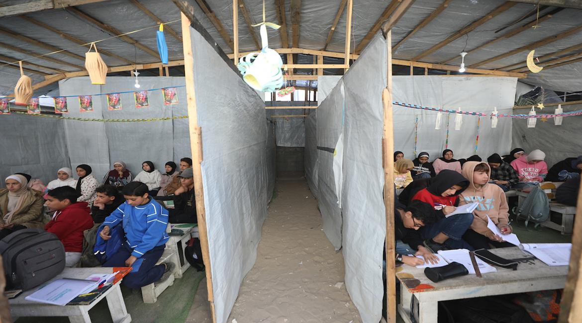 أطفال نازحون يتلقون دروساً داخل خيمة في اليرموك بـغزة، بعد تدمير معظم المدارس وتحويل بعضها لمراكز إيواء بسبب الحرب.
