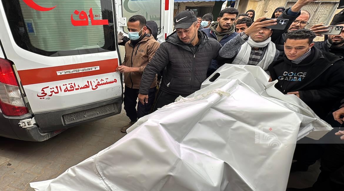 عائلة الشهيد معتصم بالله الشرفي(13 عامًا)، تودع جثمانه في مجمع ناصر الطبي بخان يونس، والذي استشهد أثناء جمعه الحطب بالقرب من دوار بني سهيلة في جنوب قطاع غزة