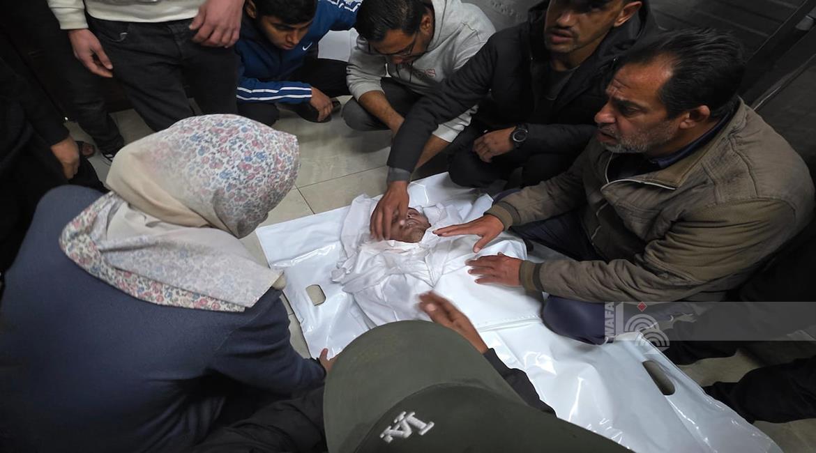 تشييع الرضيعة سجود عليان بعد سبعة أيام من ولادتها في مستشفى ناصر بخان يونس قضت نتيجة حرمانها من السفر لتلقي العلاج في الخارج