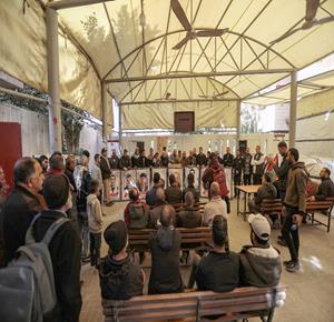 مواطنون يتلقون وجبات ساخنة وزعتها إحدى الجمعيات الخيرية في مخيم النصيرات للاجئين وسط نقص حاد في الغذاء