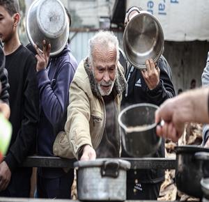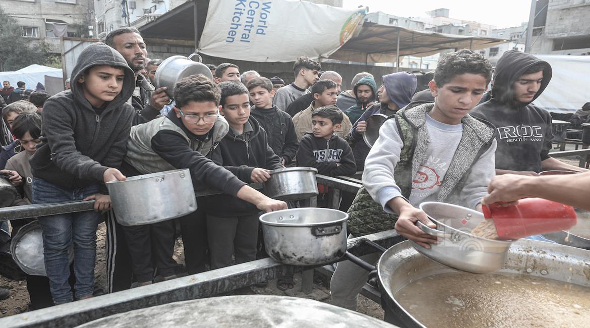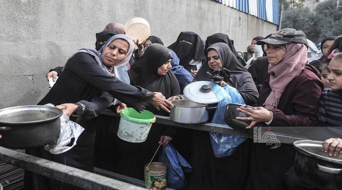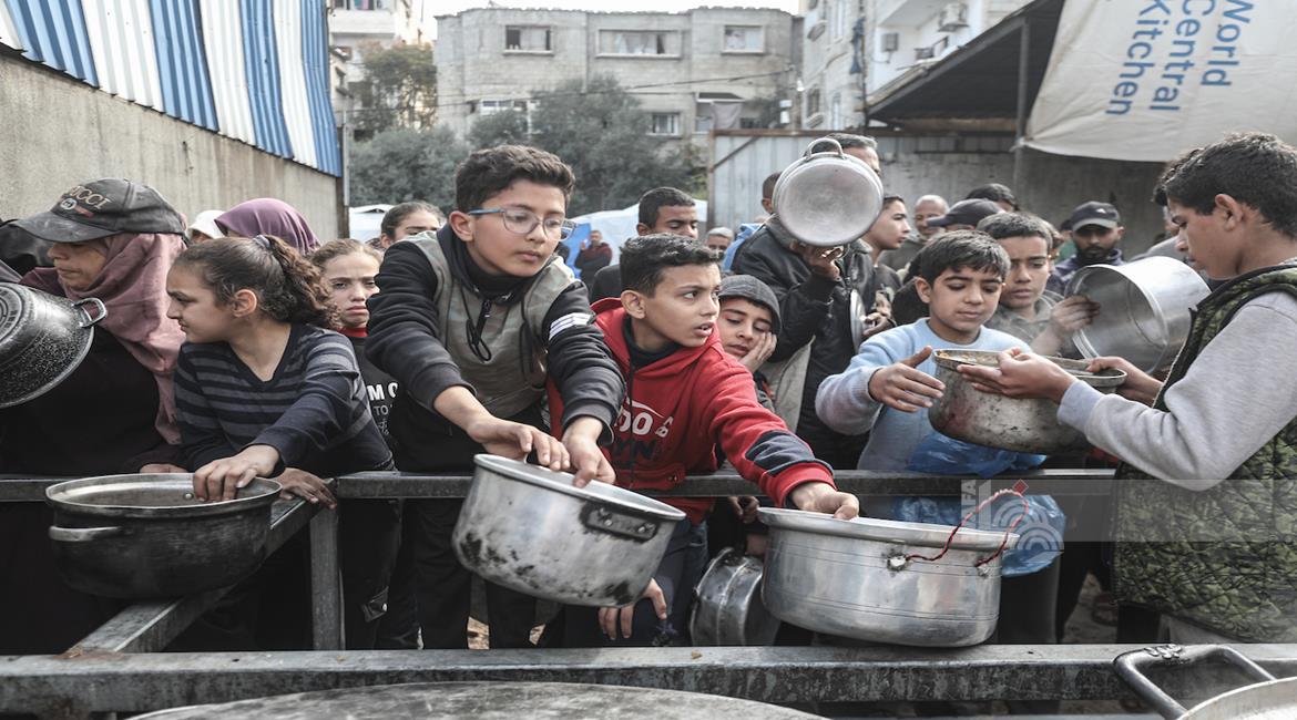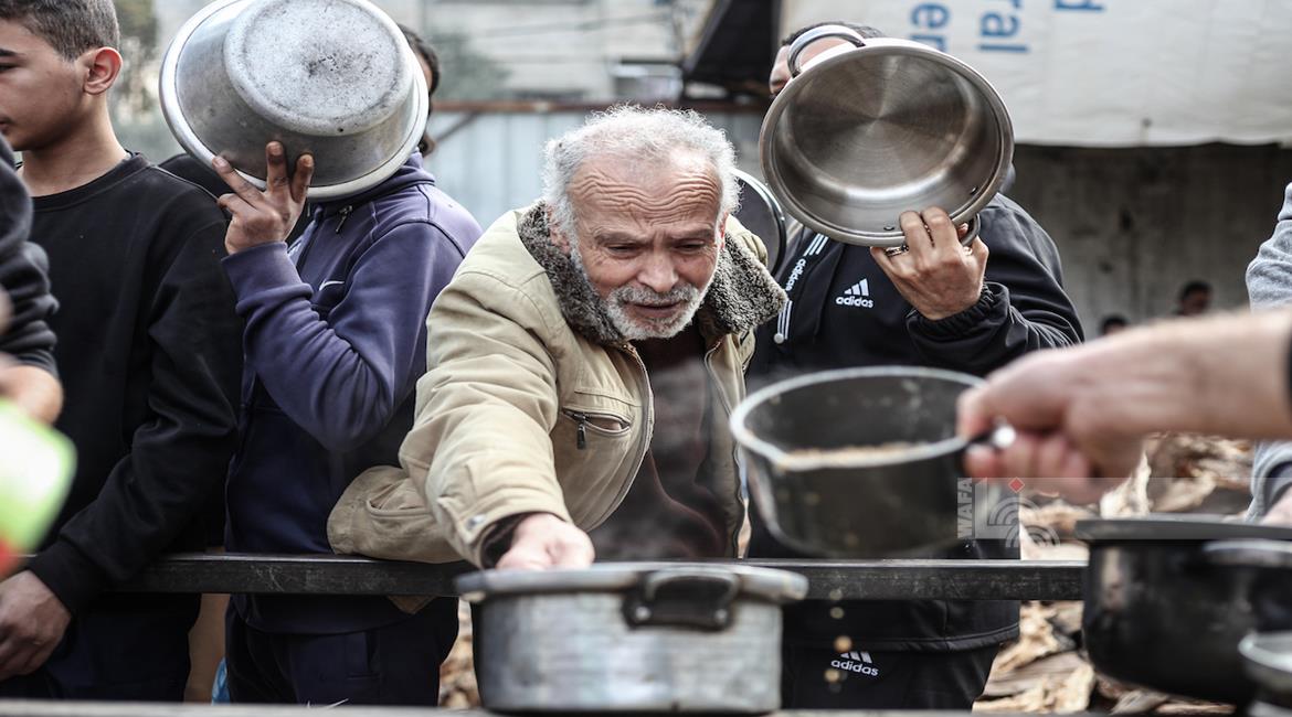غزة - مواطنون يتلقون وجبات ساخنة وزعتها إحدى الجمعيات الخيرية في مخيم النصيرات للاجئين وسط نقص حاد في الغذاء