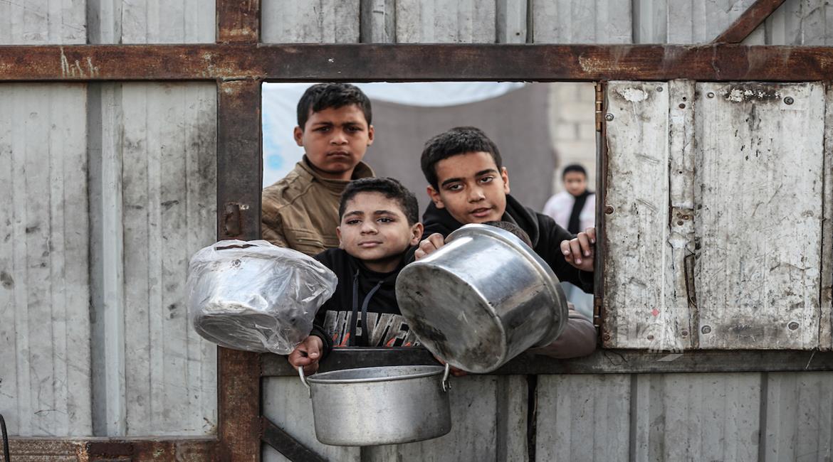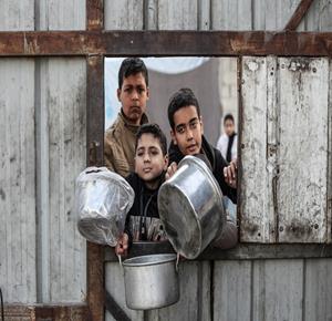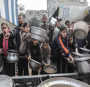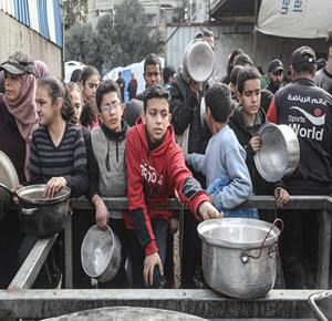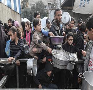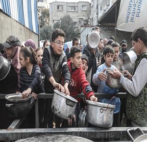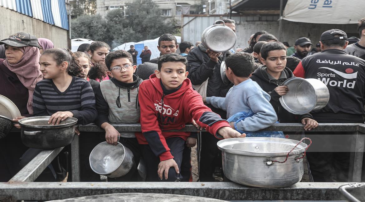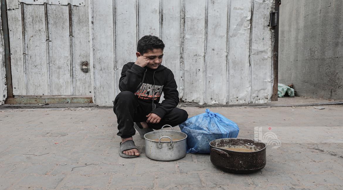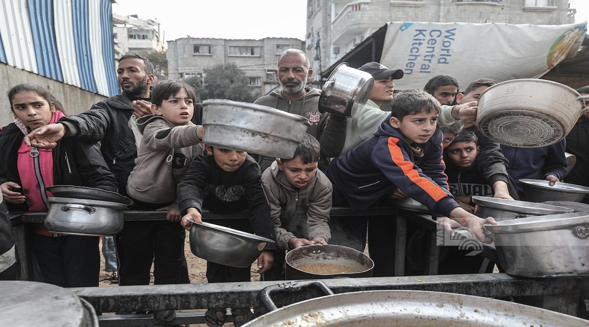 غزة - مواطنون يتلقون وجبات ساخنة وزعتها إحدى الجمعيات الخيرية في مخيم النصيرات للاجئين وسط نقص حاد في الغذاء