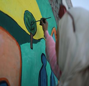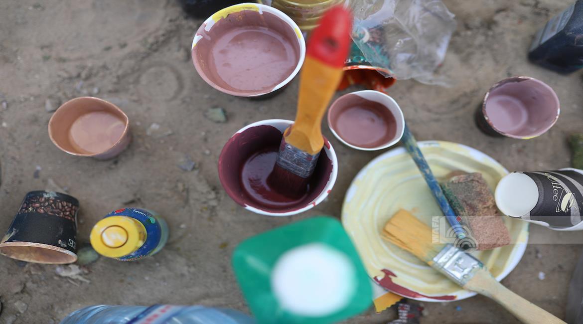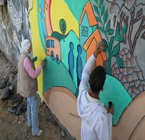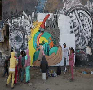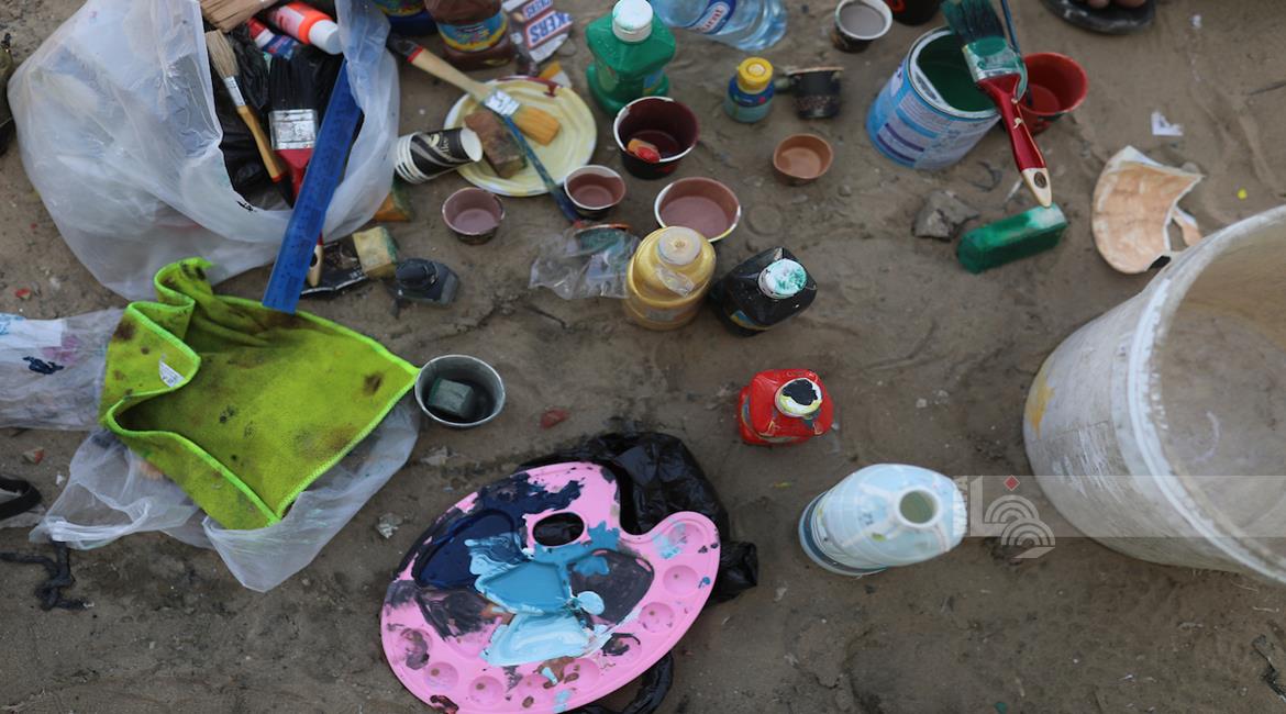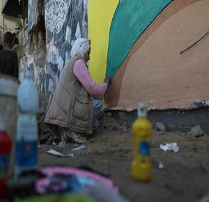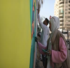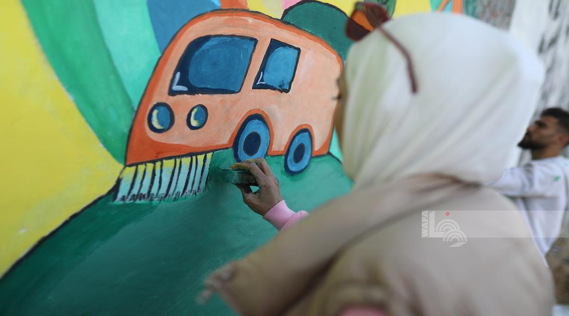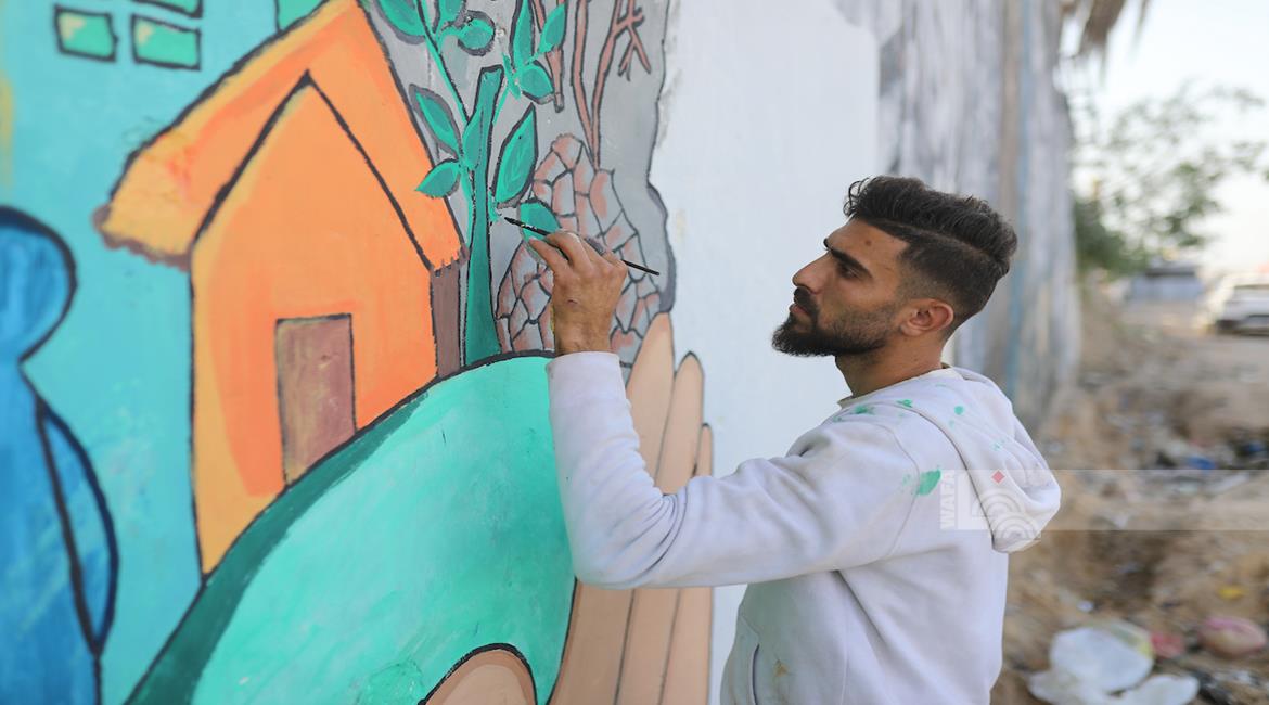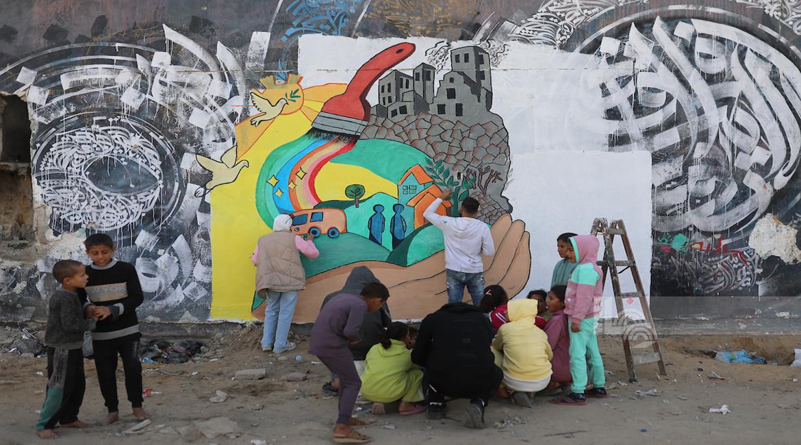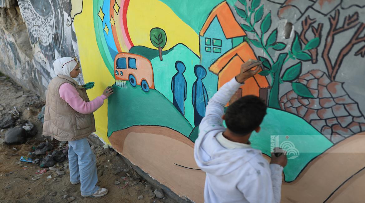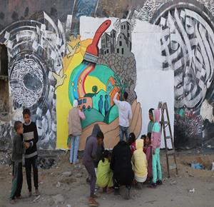 غزة - فنانون يرسمون جدارية على جدران جامعة الأزهر بغزة بعنوان «من الركام إلى الحياة» تجسد الصمود والأمل