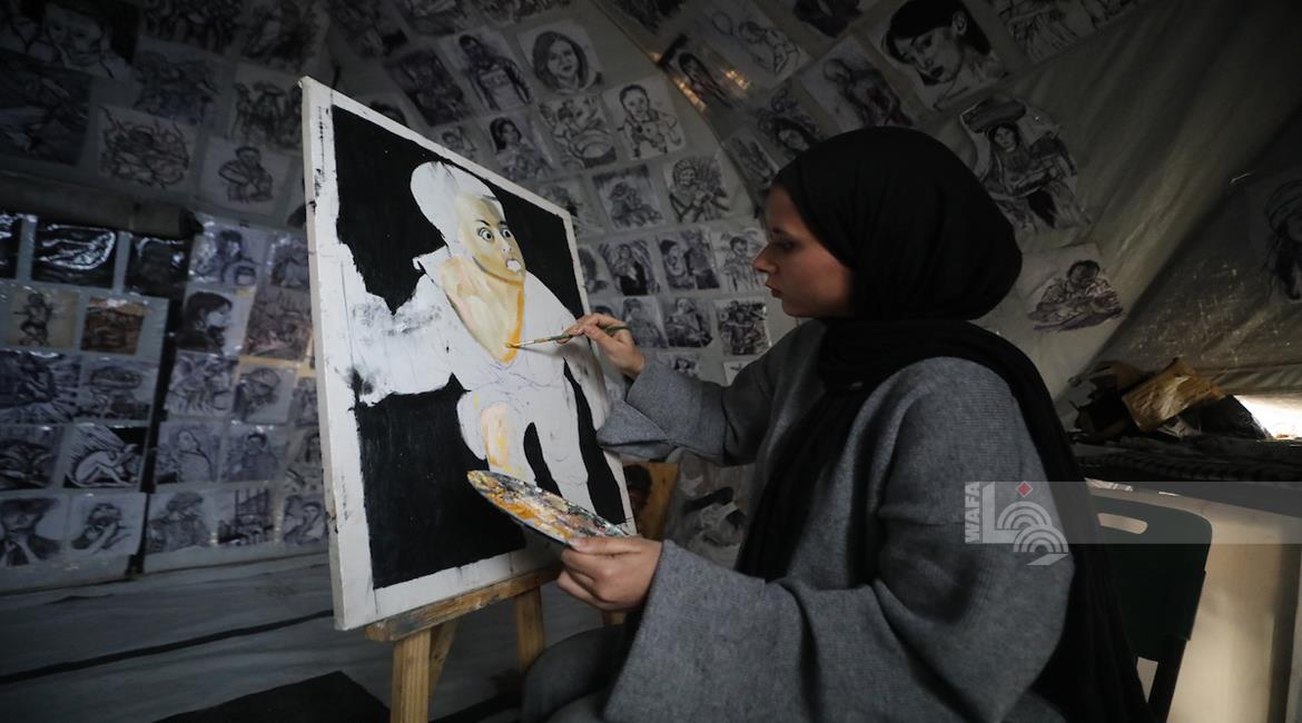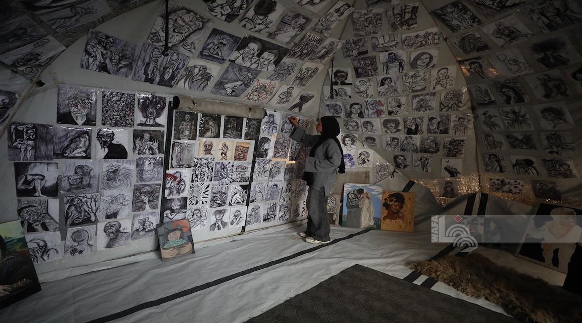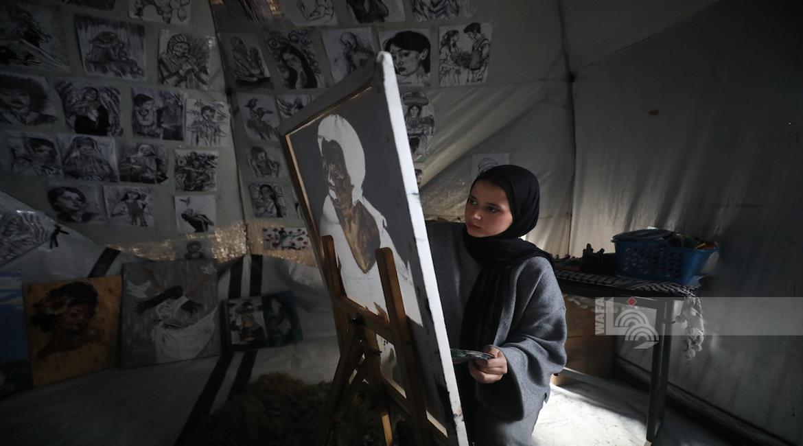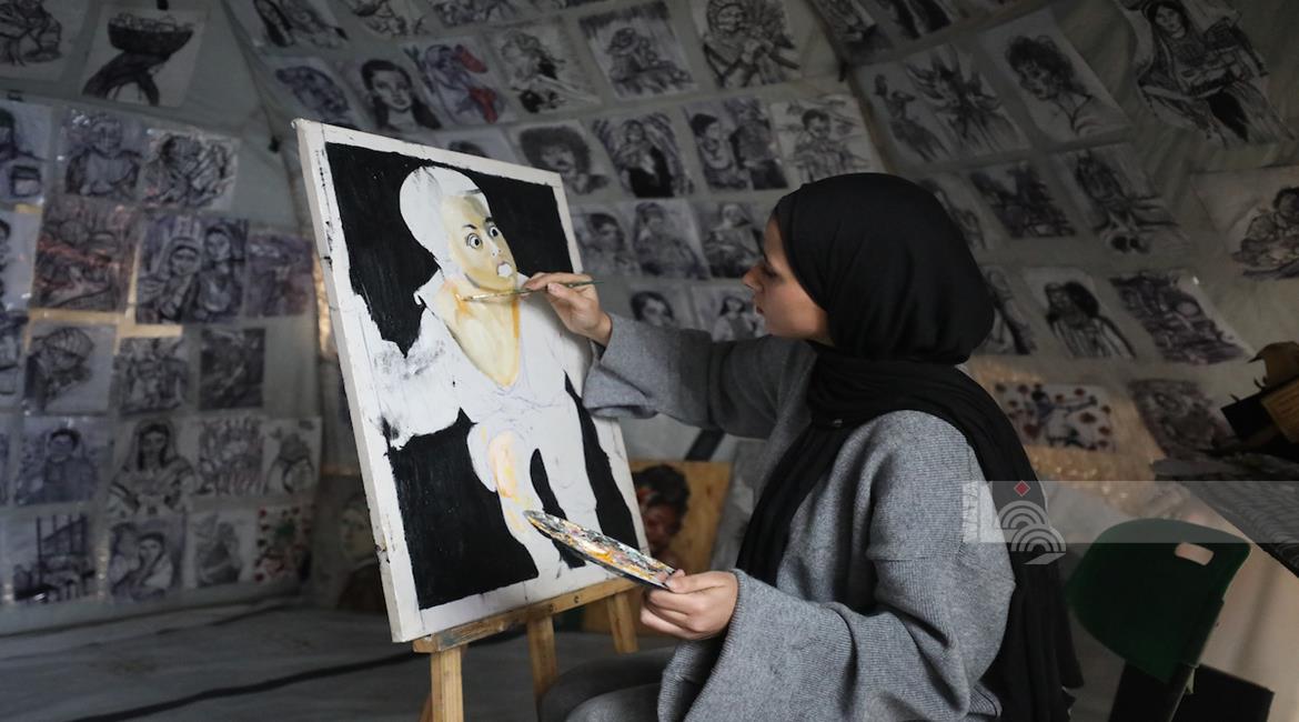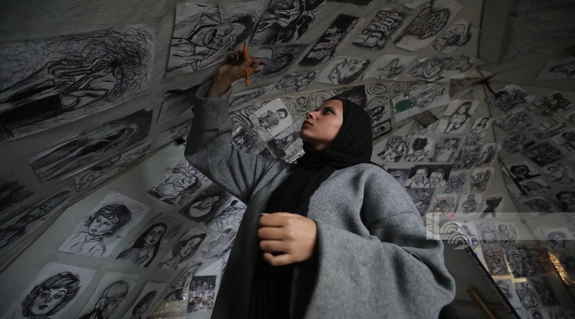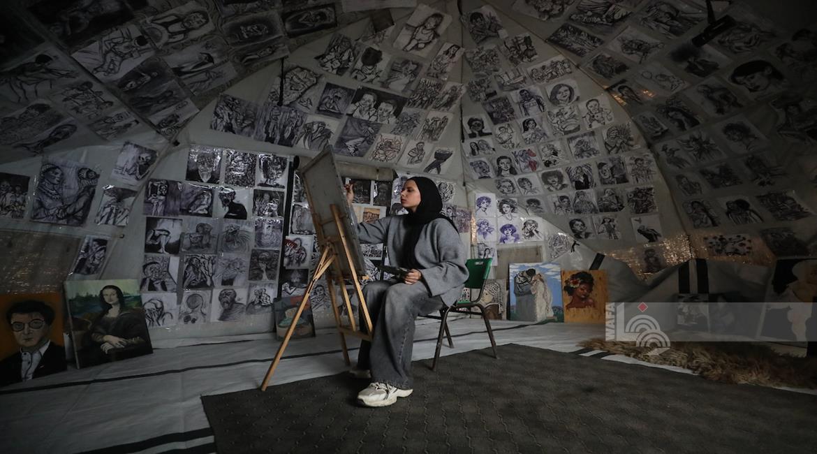 غزة - الرسامة مرَح الزعانين (18 عاما) تحول خيمة نزوحها في مدينة غزة إلى مساحة فنية صغيرة مستندة إلى موهبتها في الرسم منذ الطفولة