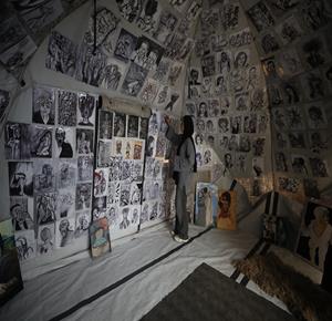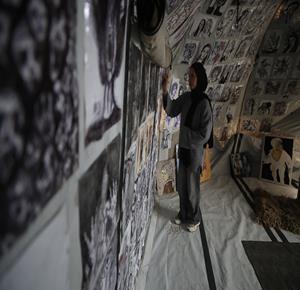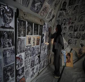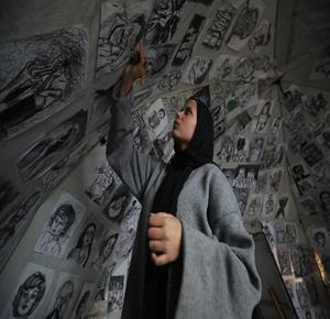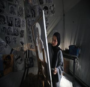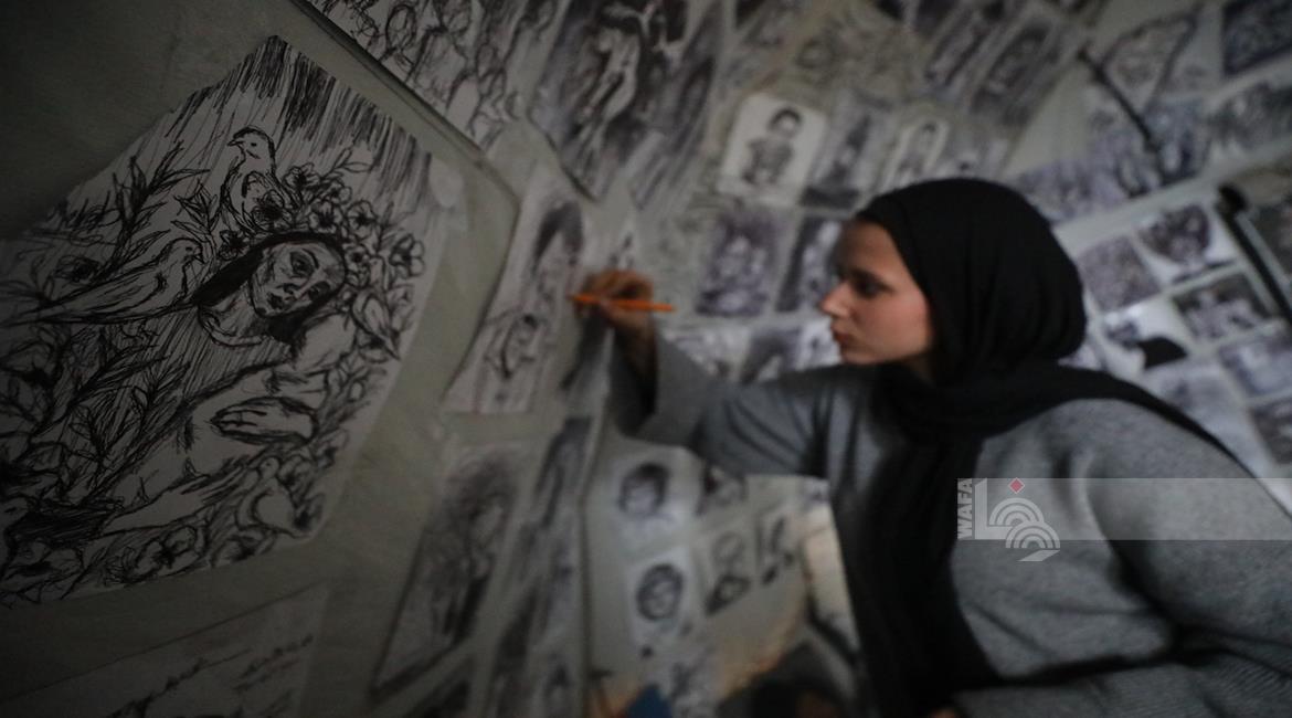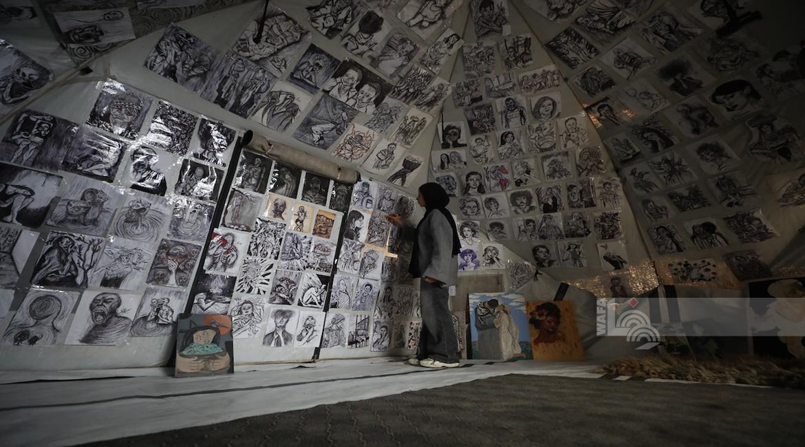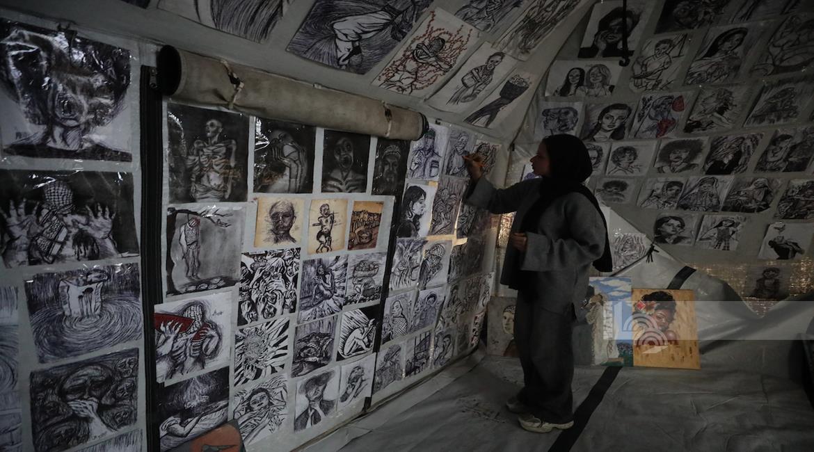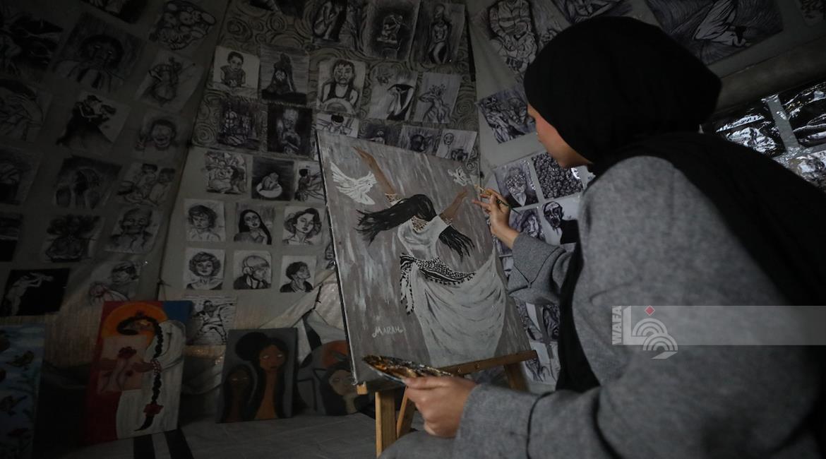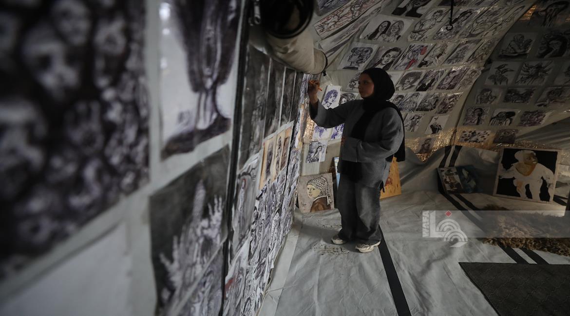 غزة - الرسامة مرَح الزعانين (18 عاما) تحول خيمة نزوحها في مدينة غزة إلى مساحة فنية صغيرة مستندة إلى موهبتها في الرسم منذ الطفولة