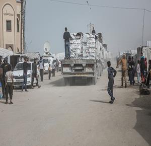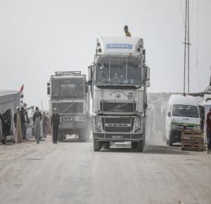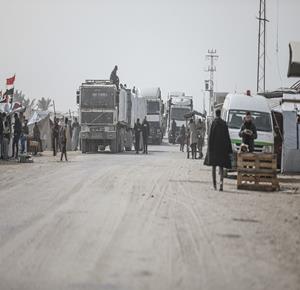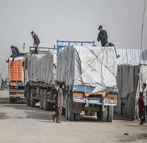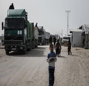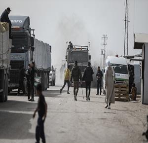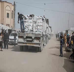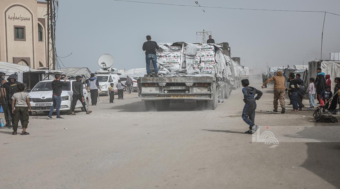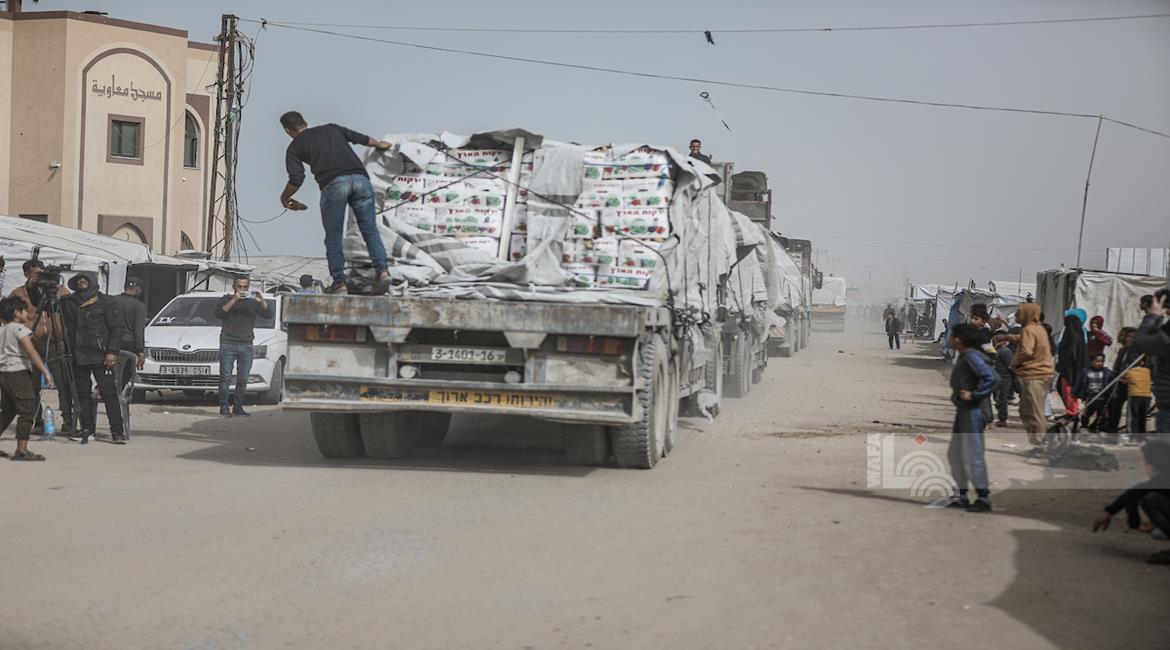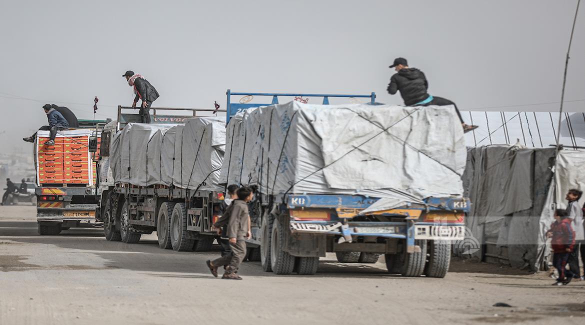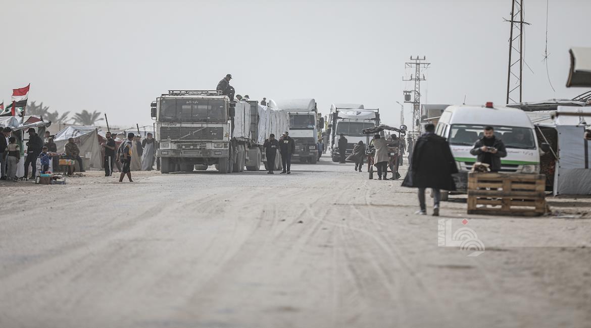 غزة - شاحنات محملة بالمواد الغذائية تمر في خان يونس بعد دخولها قطاع غزة عبر معبر كرم أبو سالم