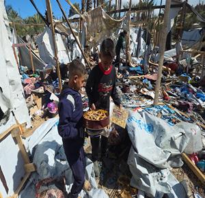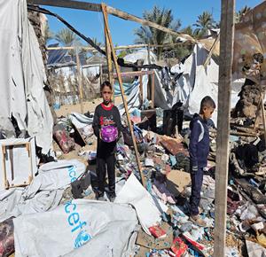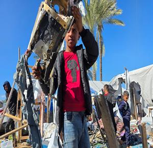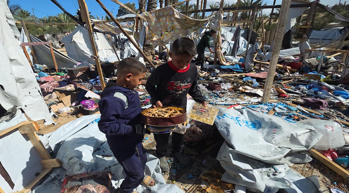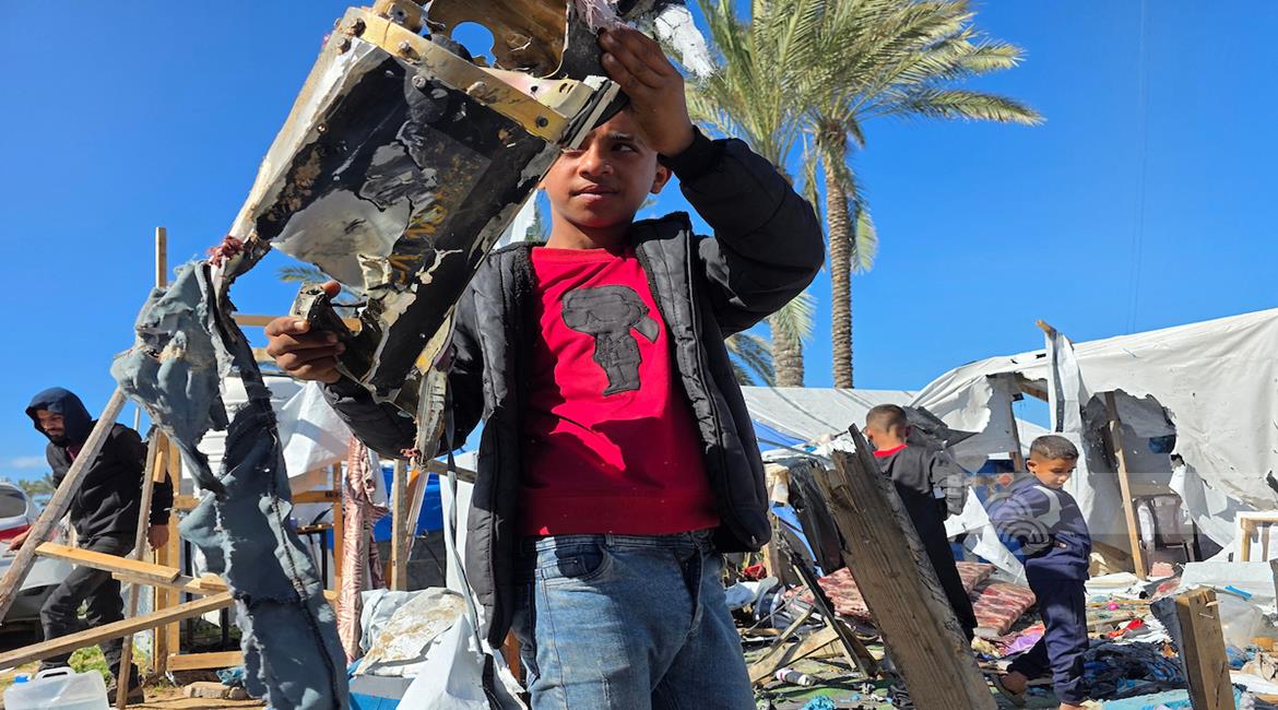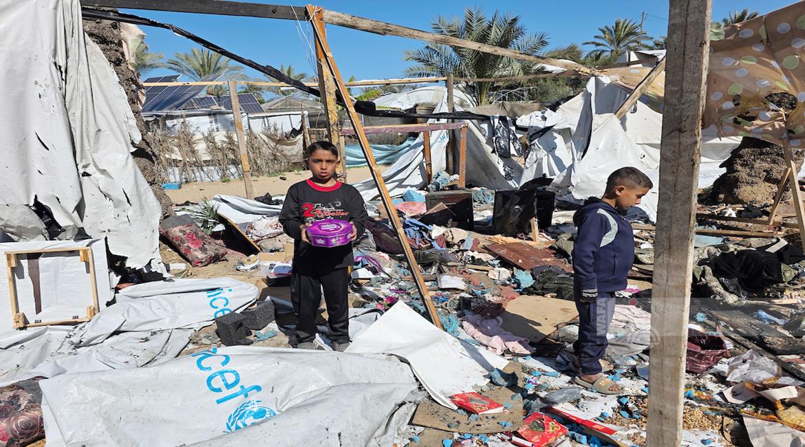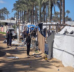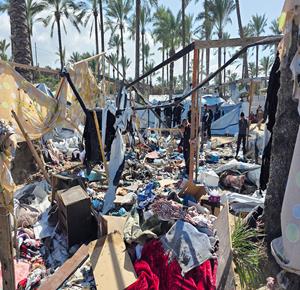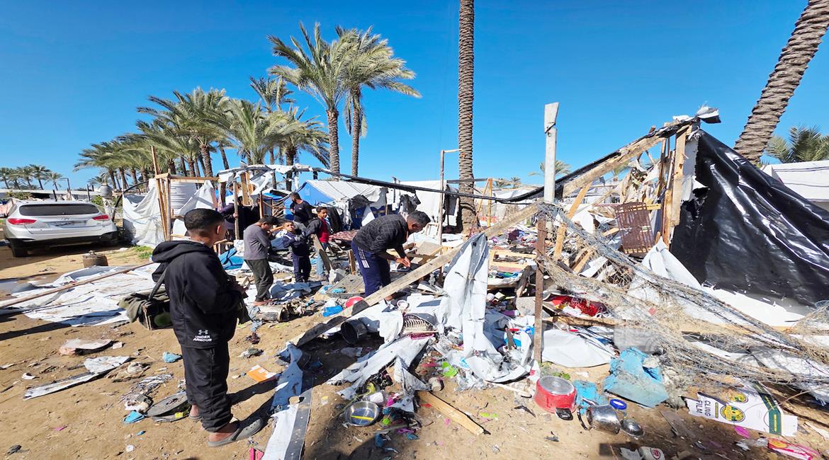 غزة - مواطنون يتفقدن الدمار بخيام النازحين بعد استهداف الاحتلال لخيمة تأوي نازحين في مواصي خان يونس